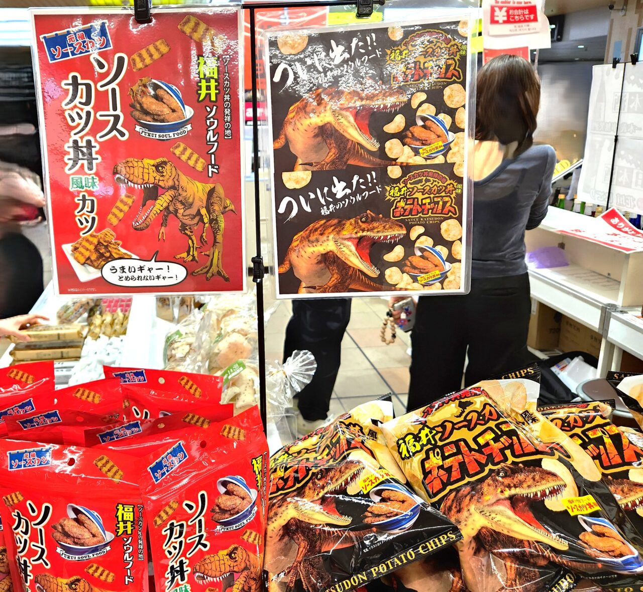 福井と言えば「福井県立恐竜博物館」が知られていますね。恐竜化石の一大産地である福井県勝山市に建てられた、恐竜を中心とする地質・古生物学の博物館ですが、恐竜をモチーフにした「かつ」や「ポテトチップス」もありましたよ♪