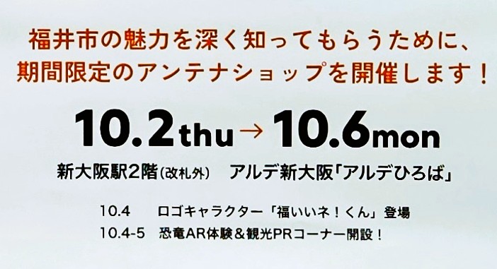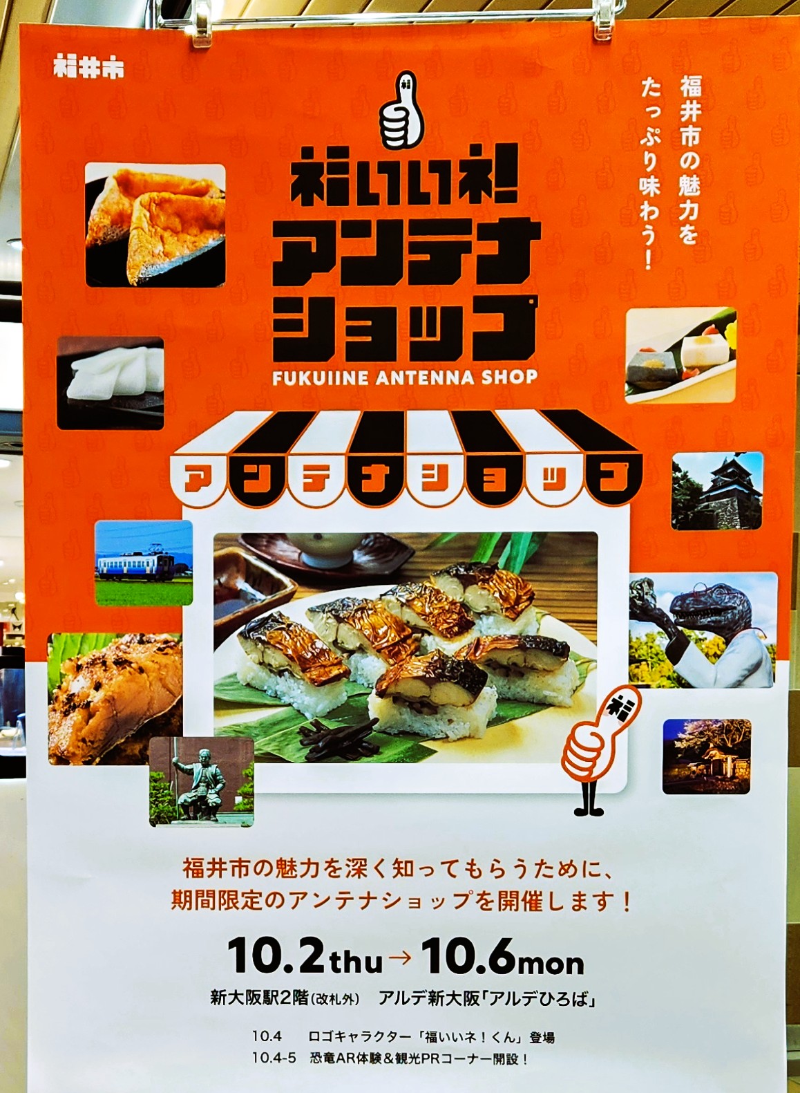 【大阪市淀川区】大阪で初開催!期間限定『福いいネ!アンテナショップ』福井の名産品に出会える♪土日は体験イベントも。10/2日(木)~6日(月)まで新大阪アルデひろば。