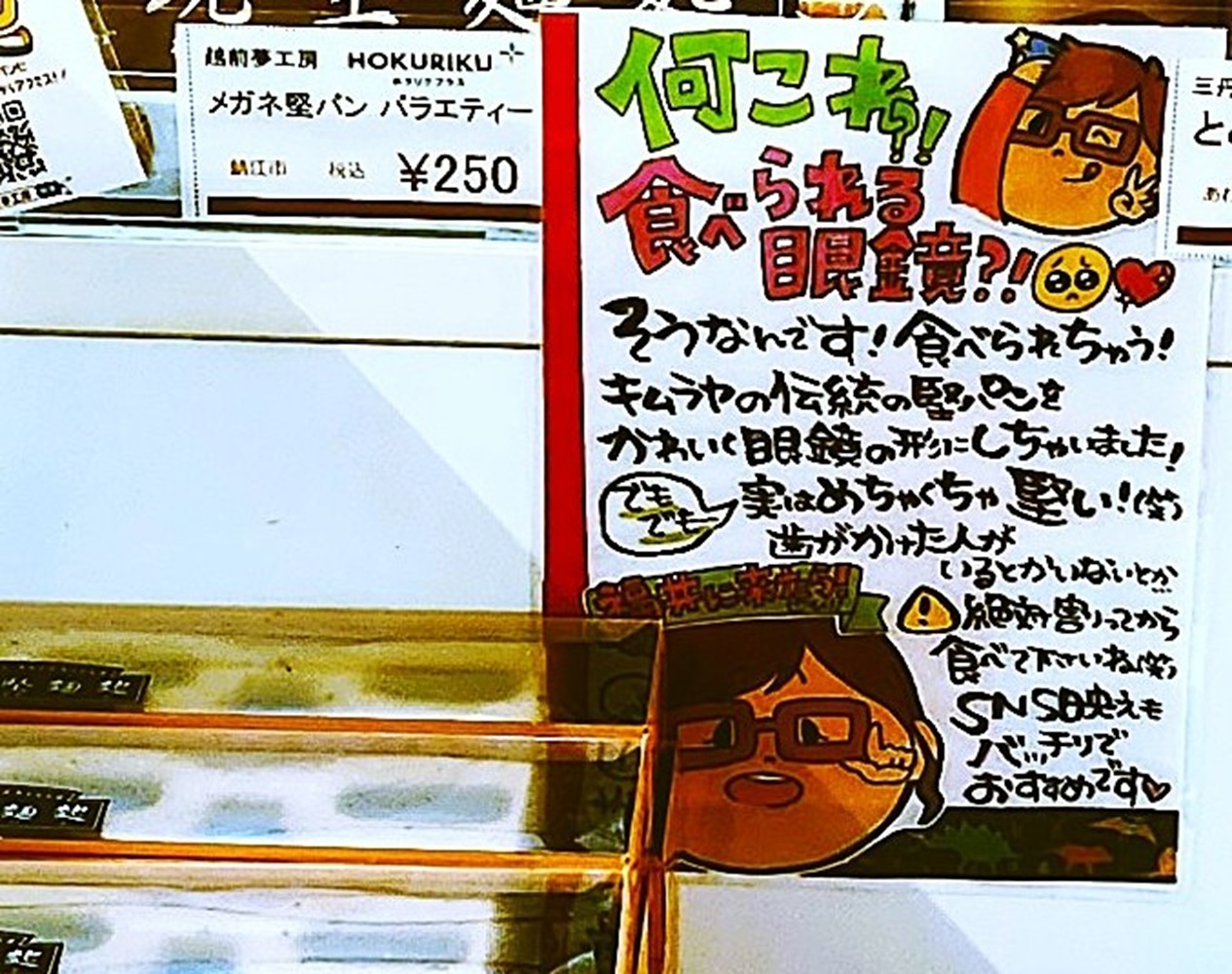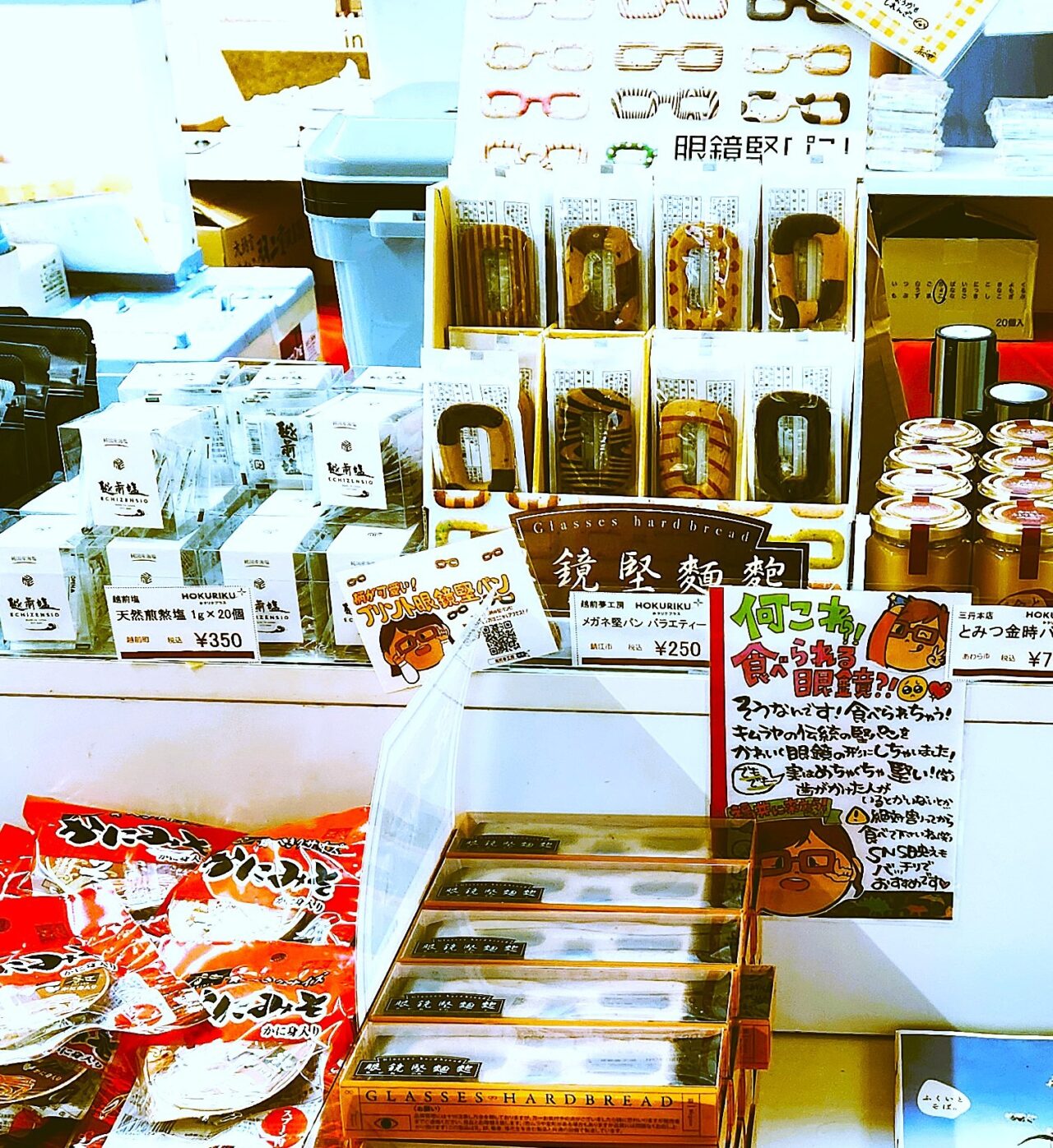 「食べられる眼鏡」と書かれたユニークな「眼鏡堅パン」にビックリ。メガネフレームの産地として知られる福井ならではの商品ですね。