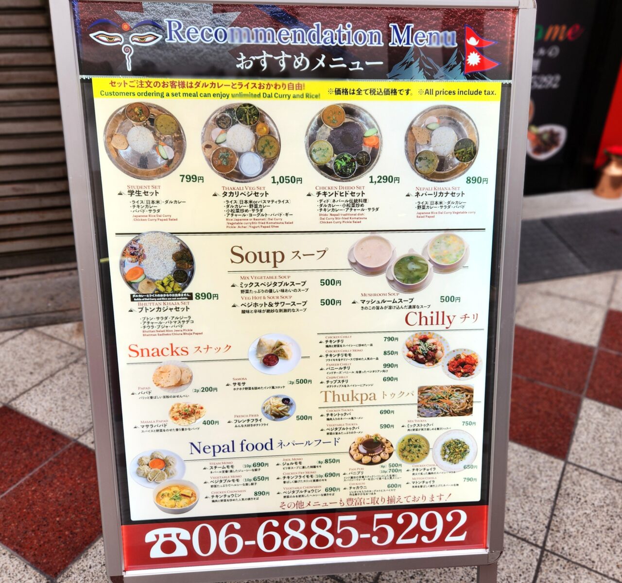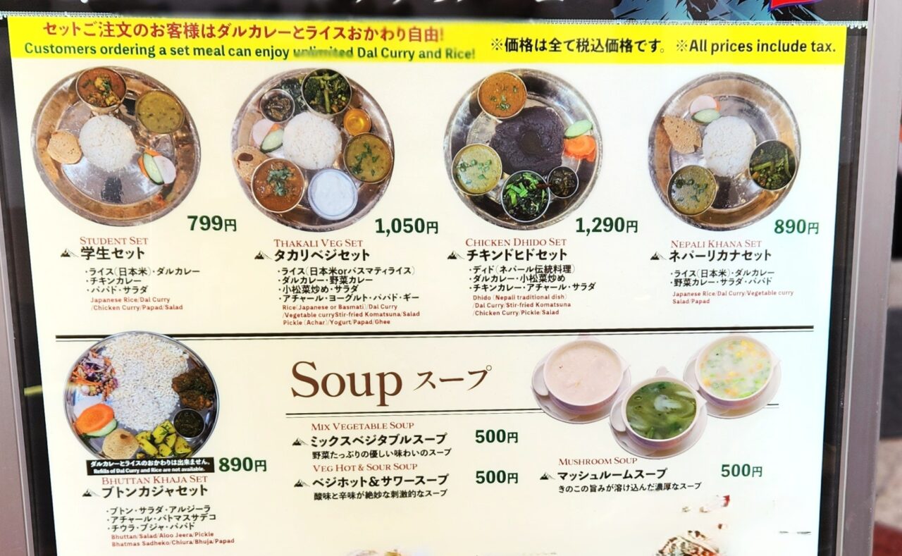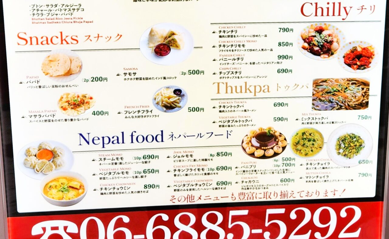 「スナック」「チリ」「ネパールフード」「トゥクパ」等、多彩なメニュー。