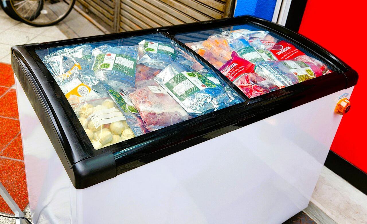 入口の前には大きな冷凍boxが置いてあり、中に色んな冷凍食品の袋が。