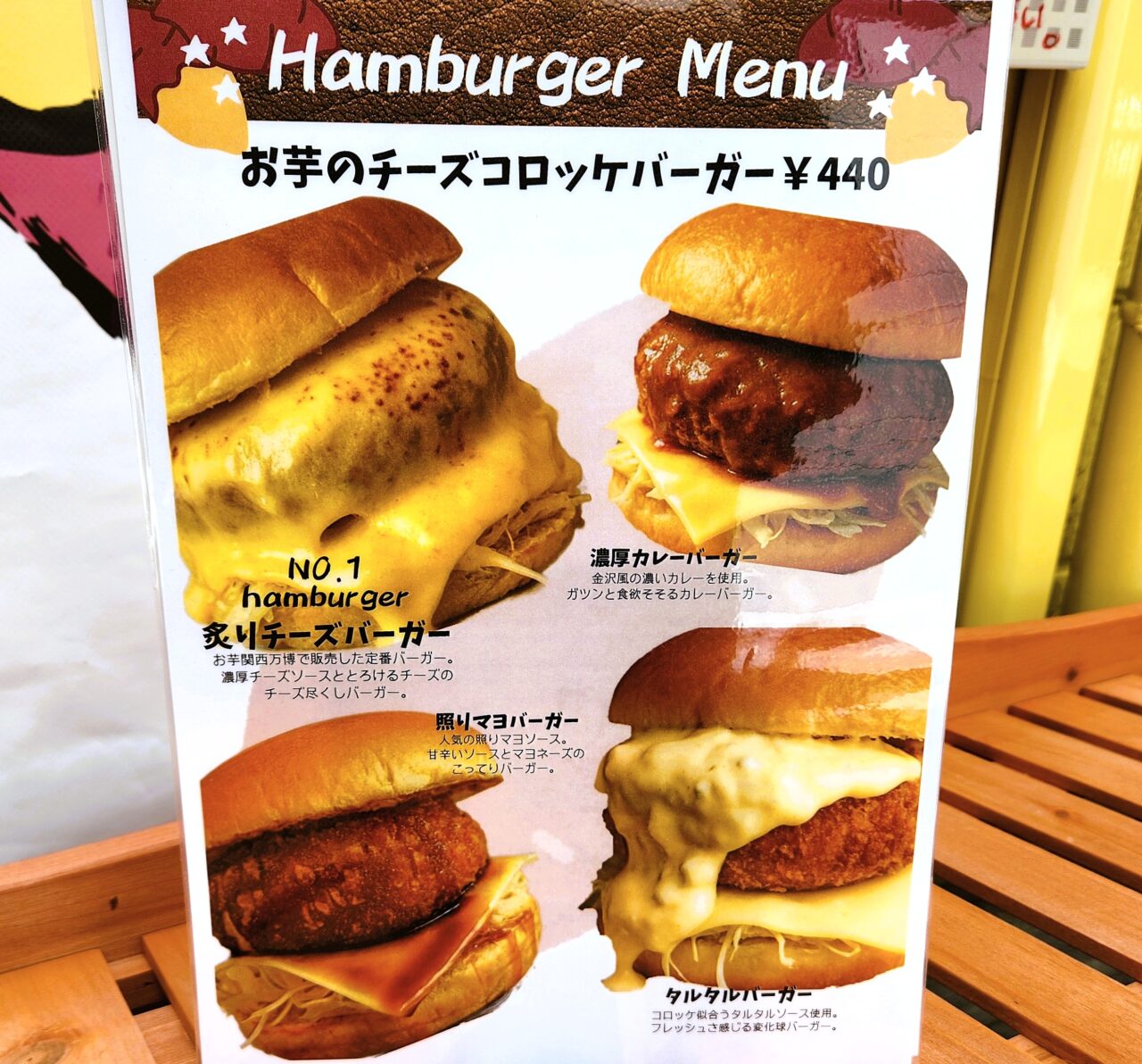「お芋のチーズコロッケバーガー」は以前「お芋関西万博」に出店した際も大人気メニューだったとか。今回は更に色んな味のものを開発し4種となっています。
