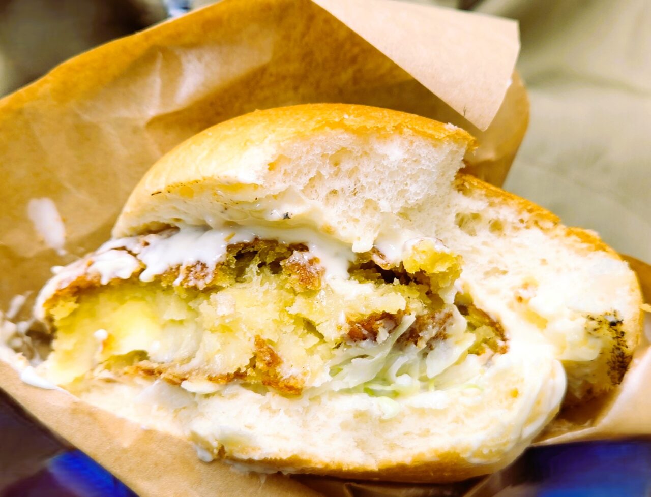 一番人気という「炙りチーズバーガー」を食べてみました。少しカオスな写真になってしまいましたが、ふわふわのバンズに、チーズが挟んであるコロッケが入っていて、炙りチーズも香ばしいバーガーです。大変ボリュームがあります。美味しいですね♪小食の方なら、これで十分お腹いっぱいになりそうです。