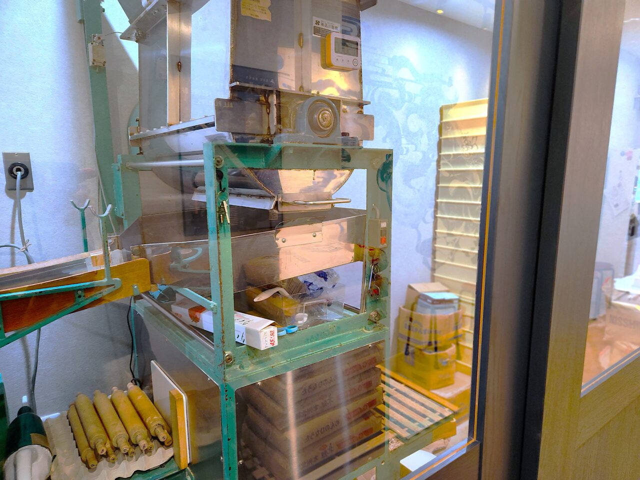 奥行きが長い店内は、入り口横に「製麺所」、壁際カウンター席、テーブル席、厨房前カウンター席という独特のレイアウトになっています。こちらはガラス越しに見える製麺所です。客席より製麺所を入口近くに設置するというのは珍しいのでは。「自家製麺」への自信が感じられるレイアウトですね。