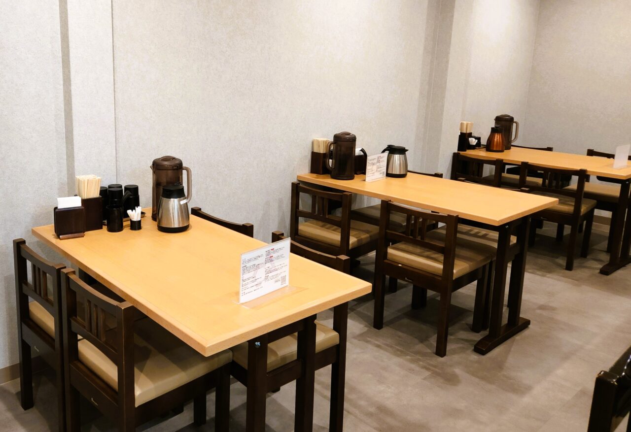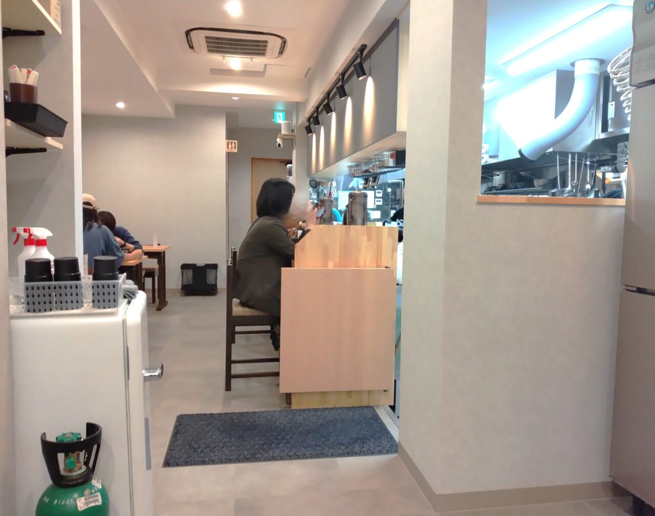 新店なので綺麗なのはもちろんですが、以前のお店に比べてゆったりと食べられるようになったというお声が多いそうです。奥には厨房の前のカウンター席とテーブル席があります。