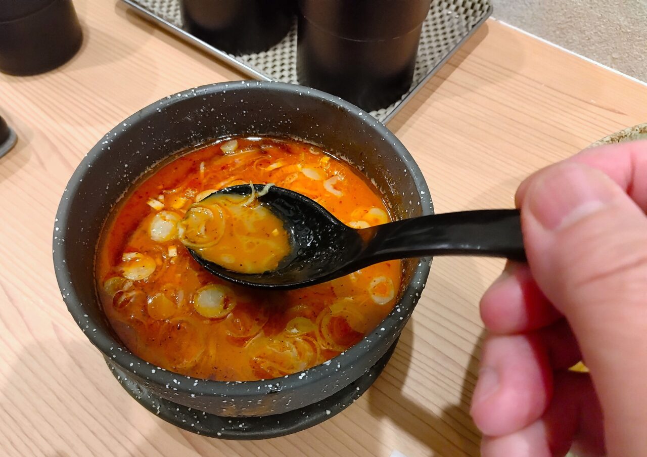 シンプルですが端正な見た目、美味しそうです。深い出汁の香り。まず、スープを一口飲んでみました。「うわっ、辛い。でも、めちゃくちゃ美味しい」というのが感想。とにかく非常に美味しいスープです。(※想像以上に辛いので一口目は少なめをおススメします)