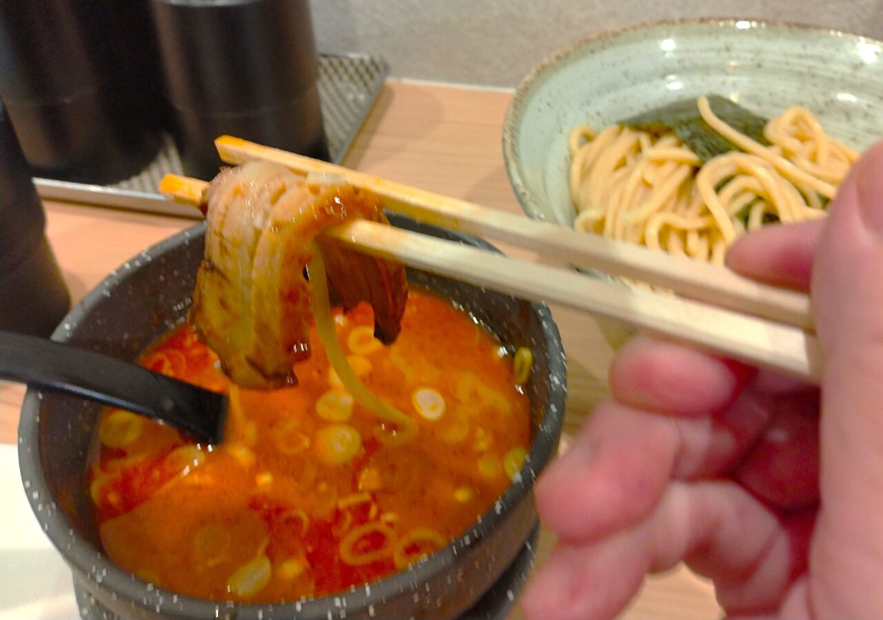 ちょっと驚いたのですがスープの中には、こんな大きなチャーシューが入っていました。トロトロの食感がたまりません。本当に美味しいつけ麺ですね。