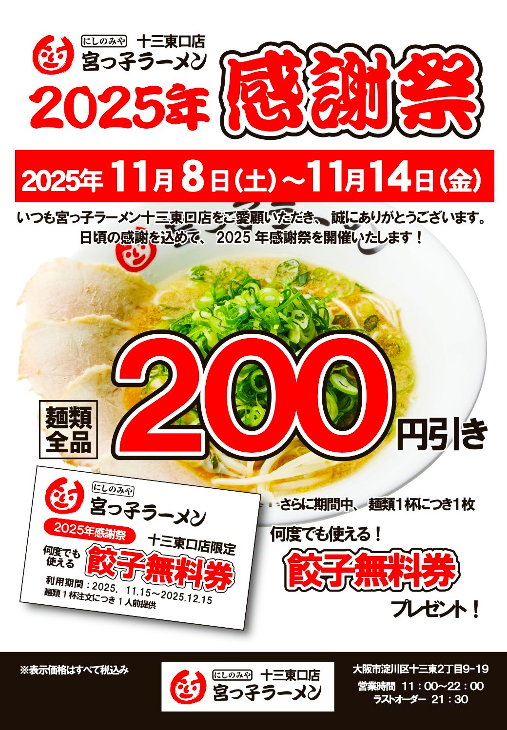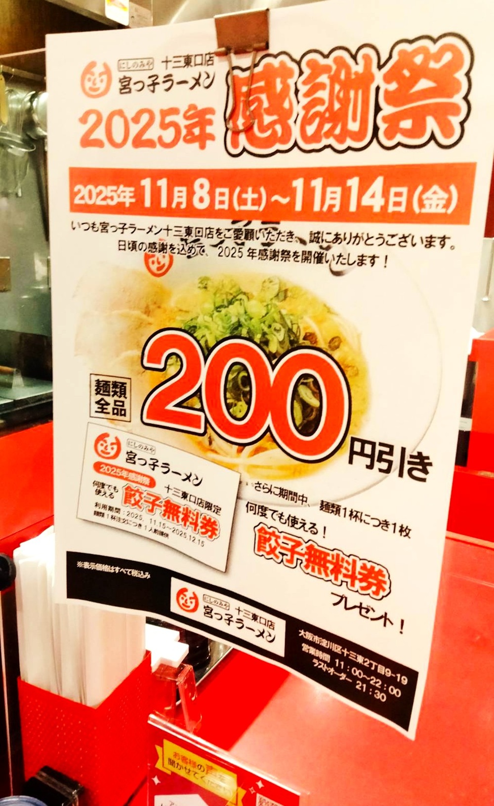 阪急電車十三駅東口前「十三駅前通商店街」のラーメン屋さん「宮っ子ラーメン十三東口店」で、2025年のご愛顧への感謝を込めて『2025年お客様感謝祭』が開催されています。実施期間は、2025年11月8日(土)〜14日(金)の1週間。実際に訪れてみました。