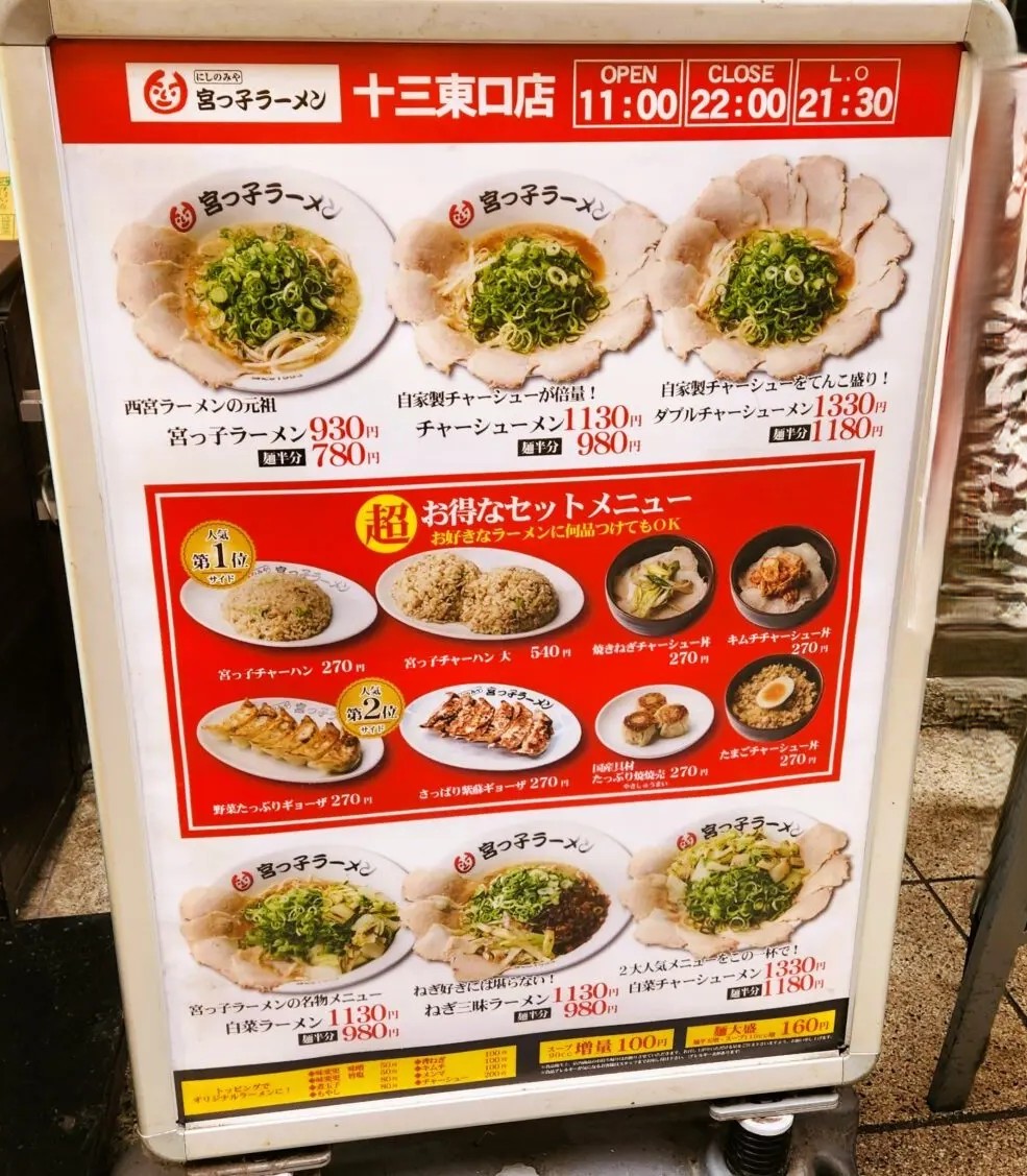 「宮っ子ラーメン十三東口店」の店頭のメニューボードを見ると、一番人気の「宮っ子ラーメン」以外にも色んな美味しいラーメンがあることがわかります。200円引きの機会に是非食べてみたくなりますね。