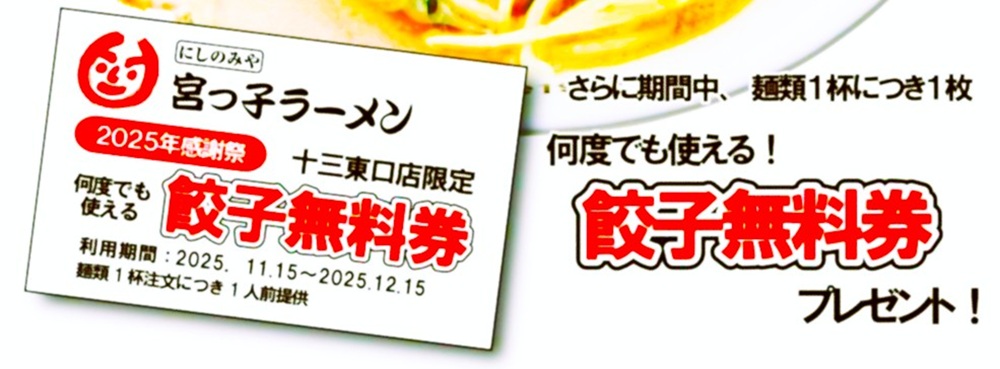 【大阪市淀川区】ラーメンをお得に食べて餃子の無料券ゲット。宮っ子ラーメン十三東口店限定『2025年お客様感謝祭』開催中」♪11月14日(金)まで。