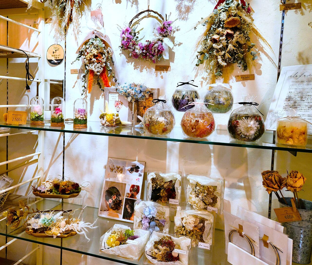 全て手作りというドライフラワーならではの自然の美しさが溢れるブーケやリース、スワッグ(※花や葉を束ねて飾るインテリアのこと)、アロマグッズ等が所狭しと飾られています。ドライフラワーを材料にして作られたヘアアクセサリー等も。