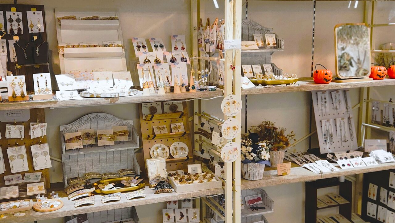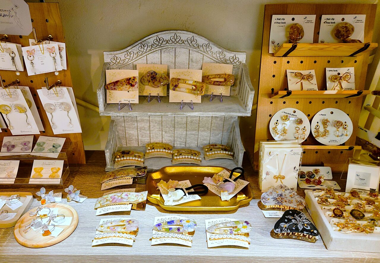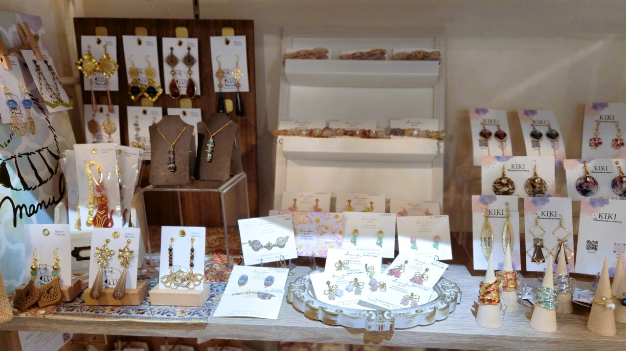 店内には「イヤリング」「ピアス」「リング」「髪飾り」「ネックレス」等、色んなハンドメイド・アクセサリーが並んでいました。