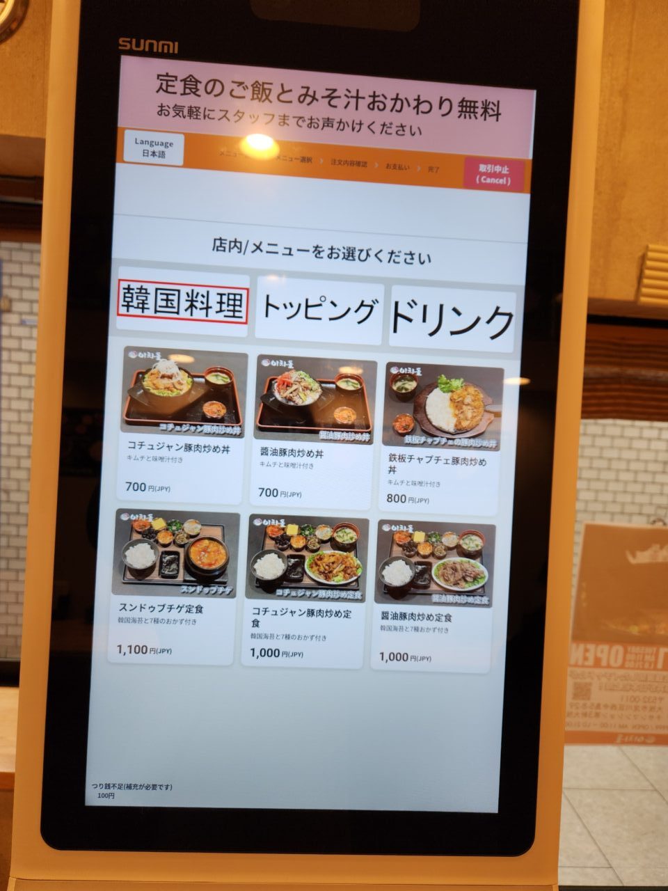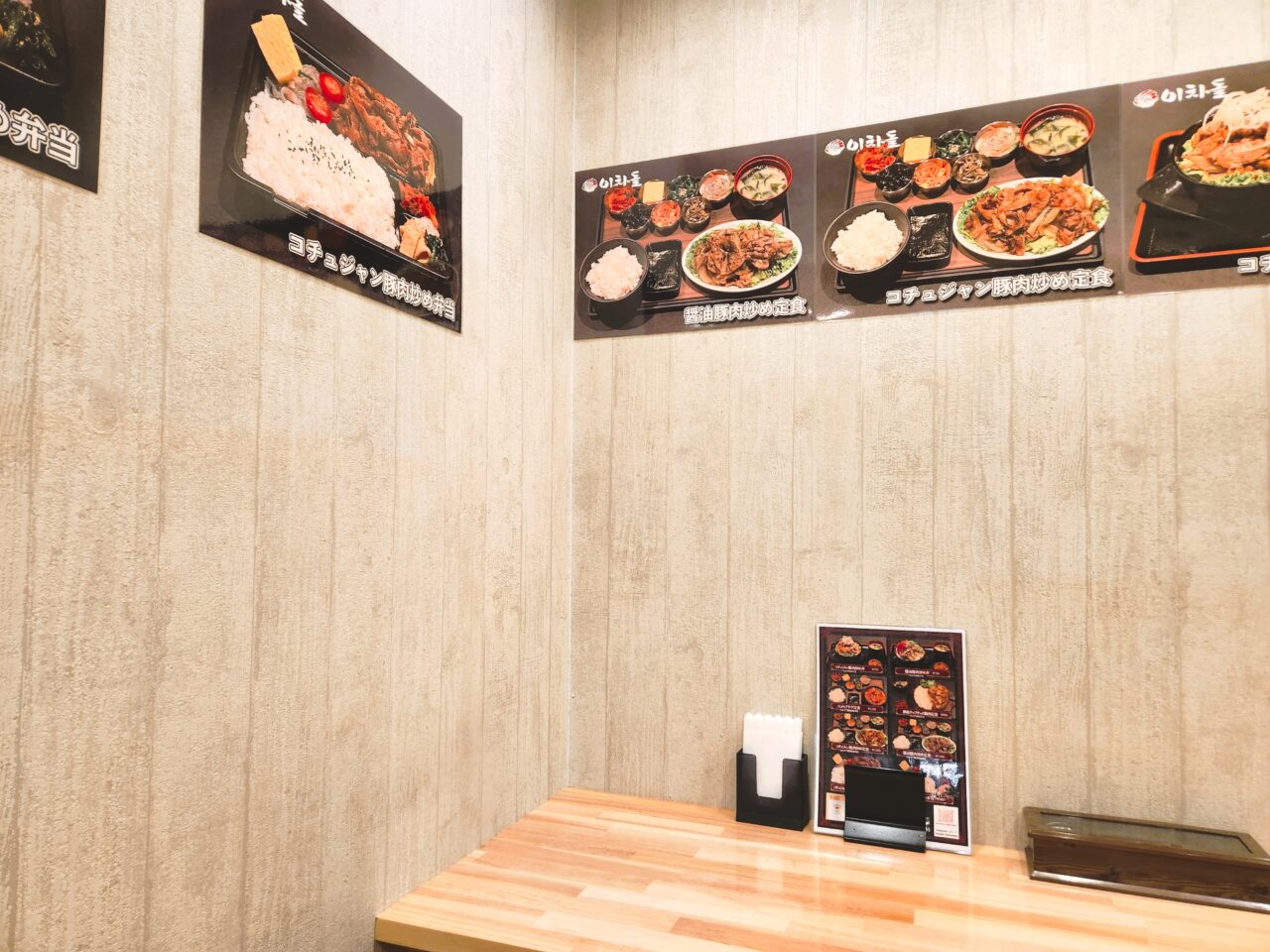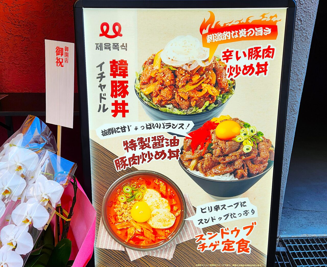インパクトの写真が載ったポスター。美味しそうですね。「韓豚丼」とは「刺激的な炎の旨さ・辛い豚肉炒め丼」のこと。他にも醤油味の丼やスンドゥブチゲ、定食等色々あるようです。