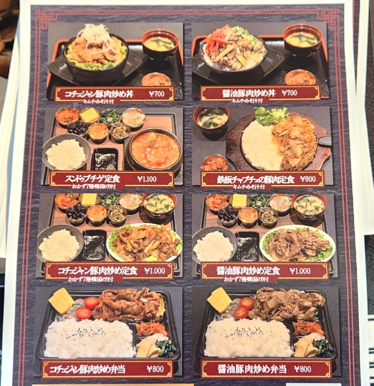 ちなみに『イチャドル韓豚丼』で提供されるお料理はこちらの8種類です。表示されている価格は全て税込です。お肉がたっぷりのものばかりですが、大変安いですね。