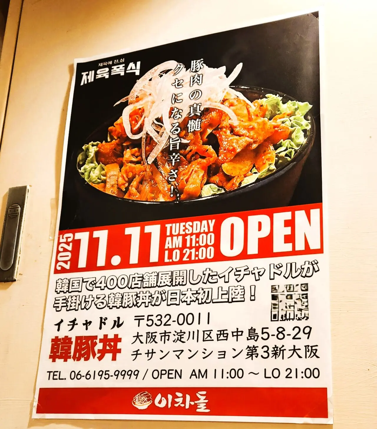 大阪メトロ御堂筋線西中島南方駅北口から徒歩で数分の場所に『イチャドル韓豚丼』という韓国で人気の定食屋さんがオープンしています。オープン日は2025年11月11日(火)です。実際に訪れて話題の「韓豚丼」を食べてみました。