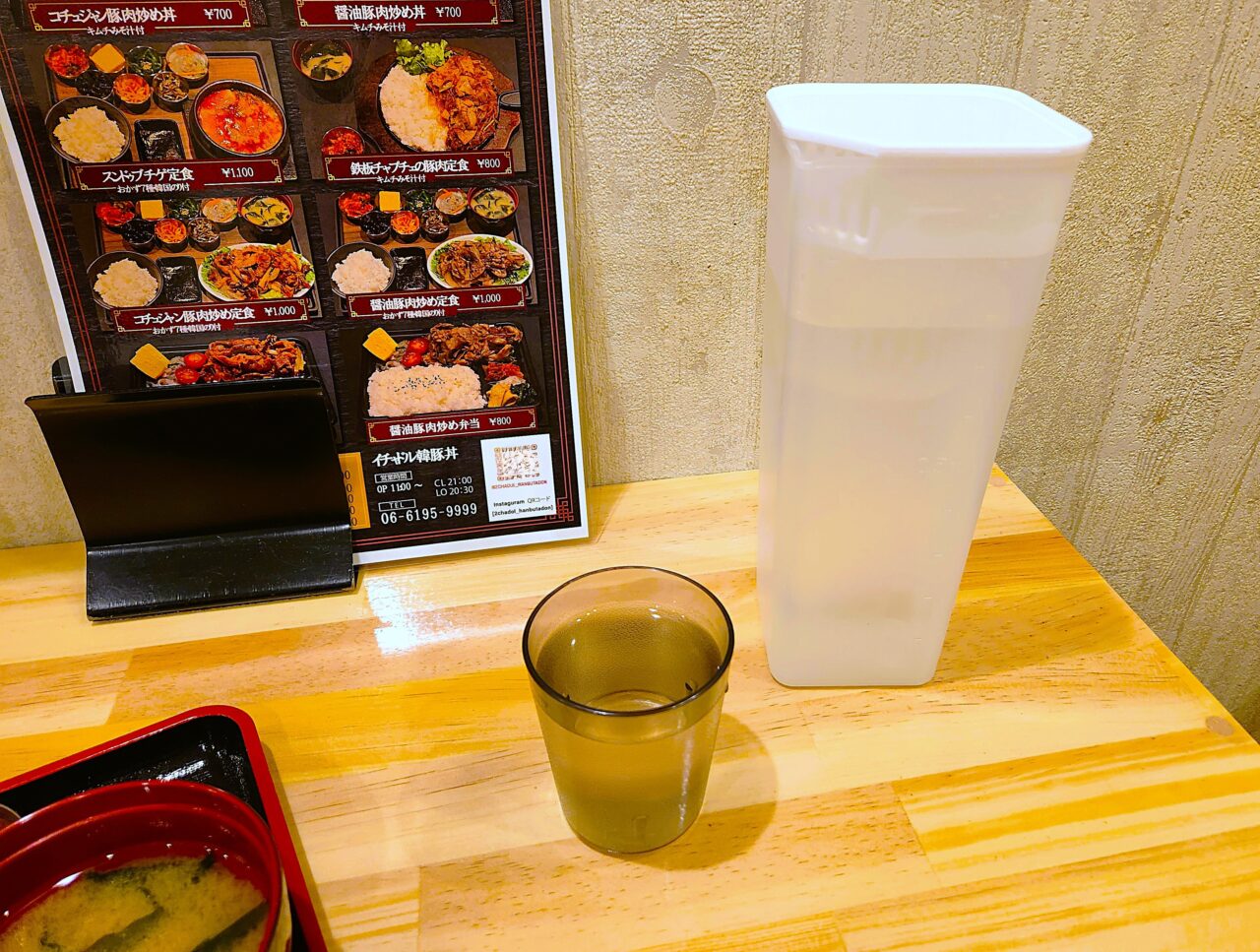 今回は、安くて看板にもイチ押しされていた「コチジャン豚肉炒め丼」をオーダーしました。お味噌汁とキムチ付き。待っている間に、スマートなボトルに入った冷水とコップを持ってきてくれました。