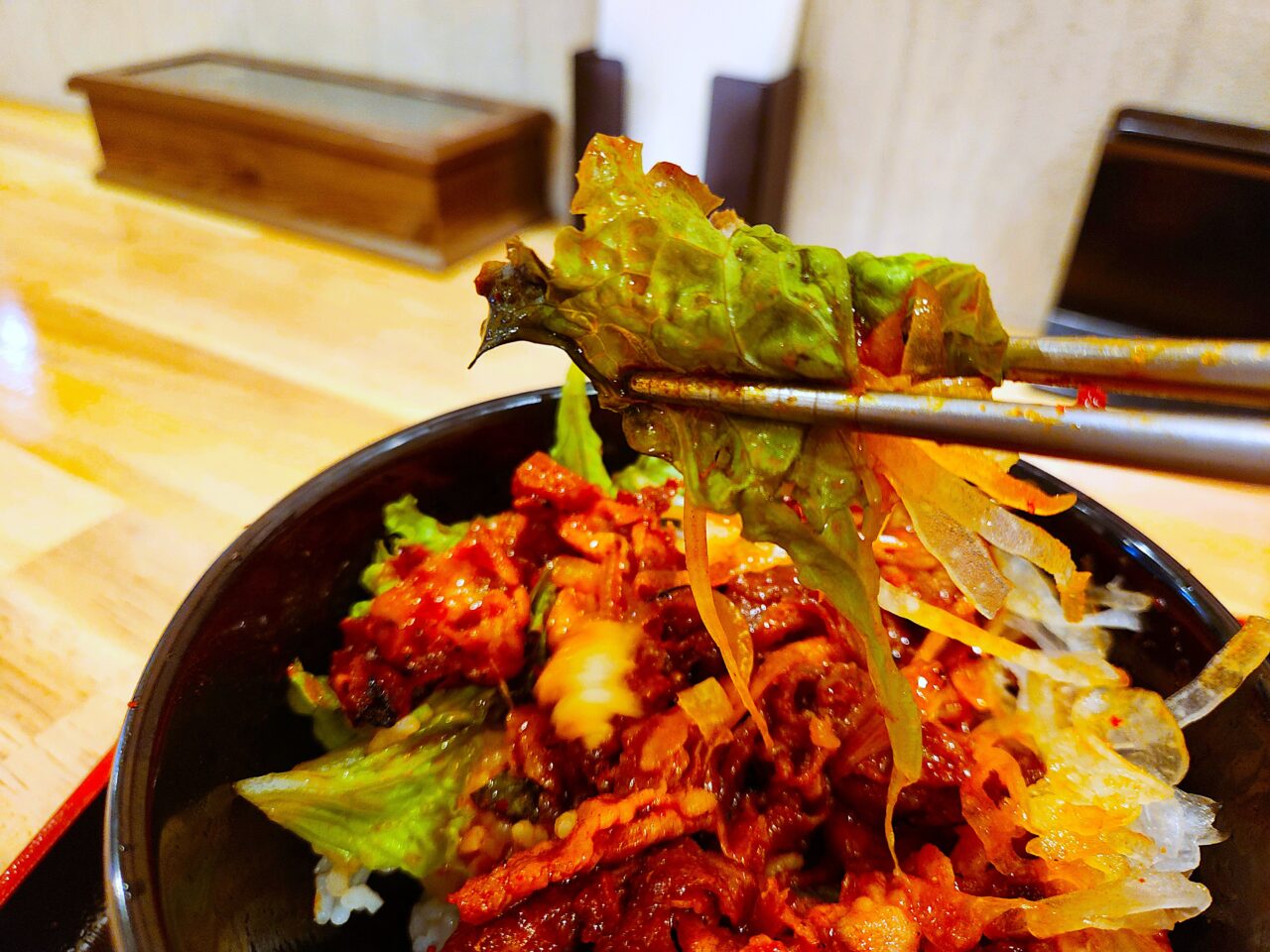 お肉とご飯の間にはサニーレタスのような新鮮な野菜。野菜でお肉をくるんで食べても美味しいです。