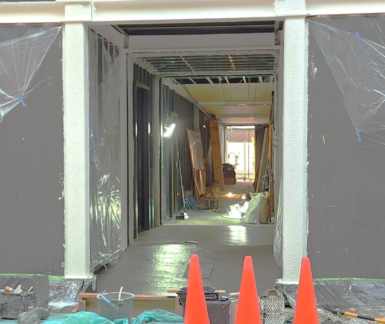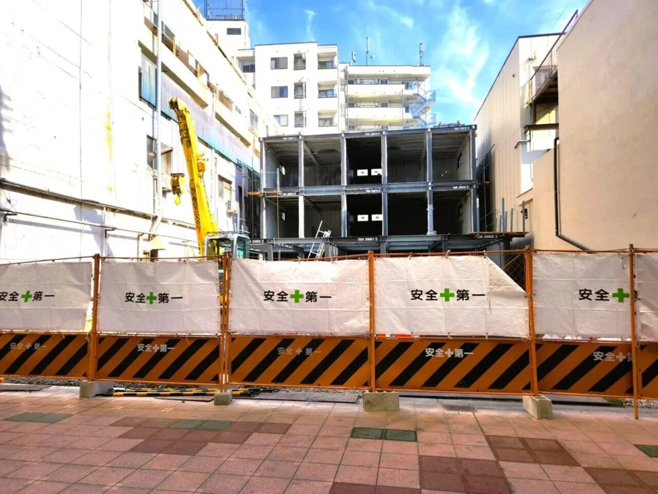 『Tsukamoto Hotel(仮称)』は商店街にぴったりと沿って敷地ギリギリまでの大きさであることがわかります。前回、2025年8月中旬に訪れた時の様子は下の写真のようだったので、かなり工事は進んでいるようですね。