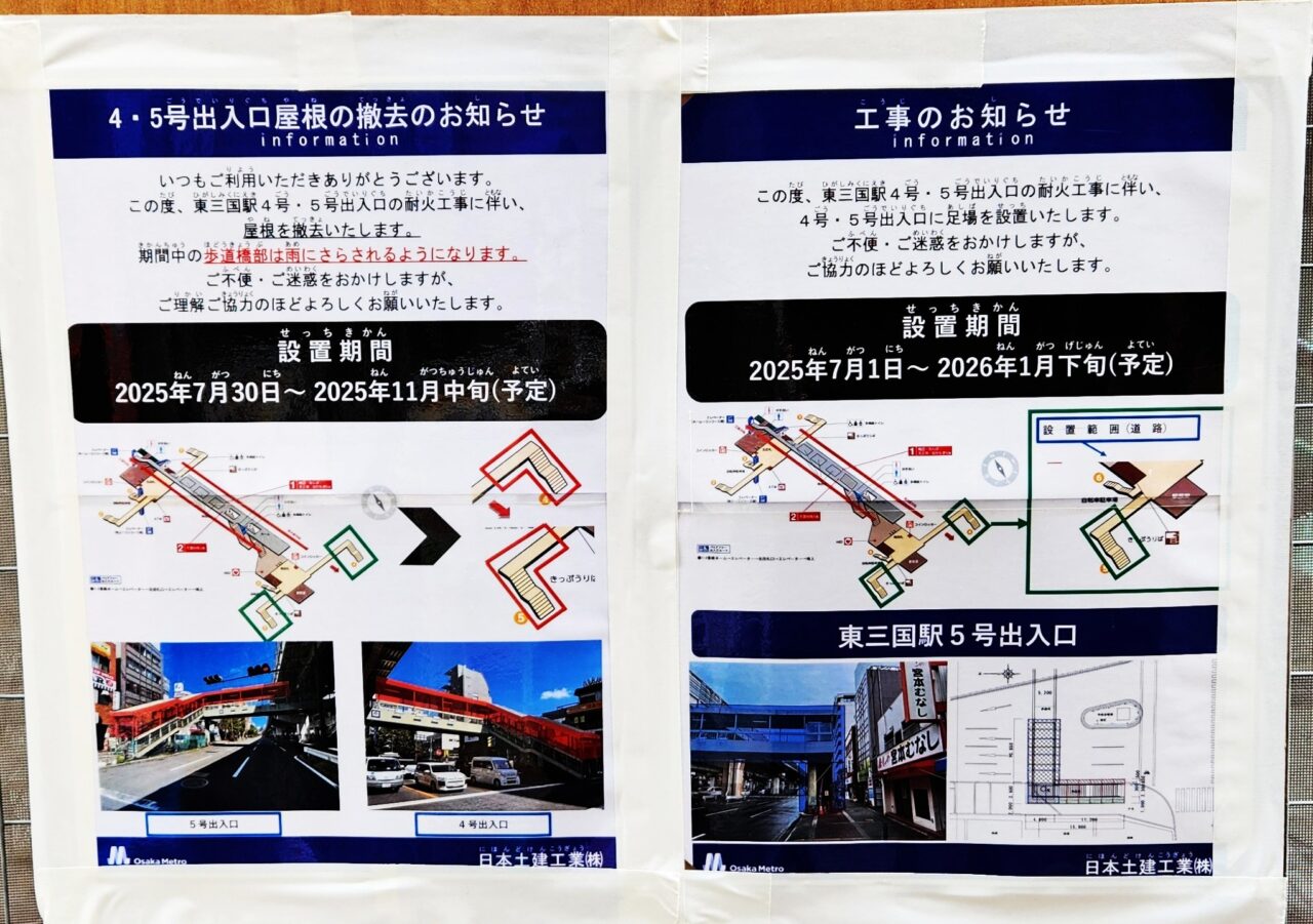 又、大阪メトロ御堂筋線東三国駅4号5号出口周辺は「耐火工事」の為、屋根が取り払われて工事中となっています。こちらは「工事のお知らせ」です。