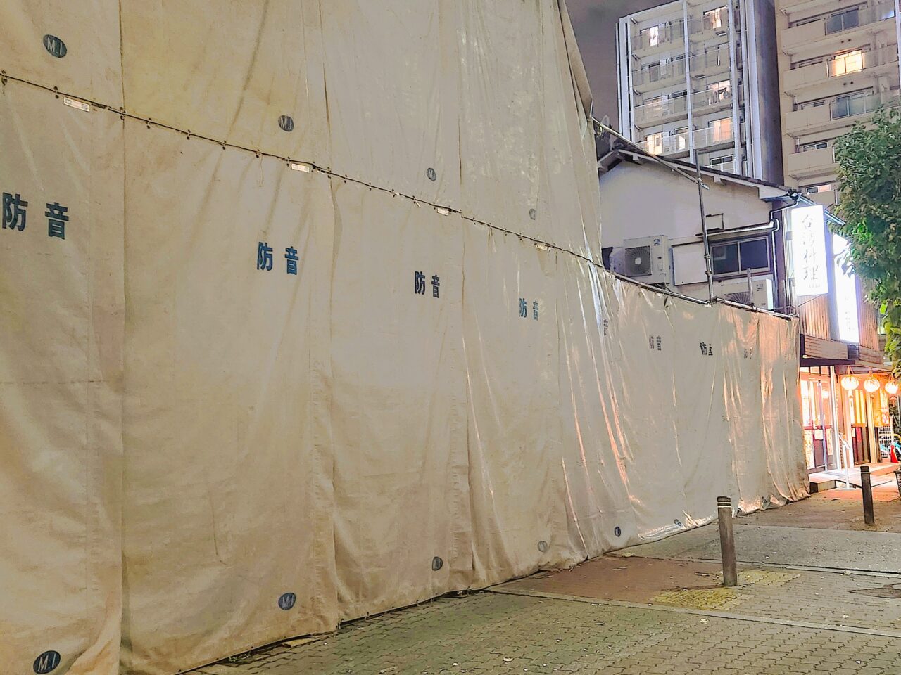 実は2025年11月2日(日)に私が前を通りかかったところ『宮本むなし 地下鉄東三国駅前南口店』元店舗の建物及び周辺一帯が大きな工事用の幌に囲まれた状態になっているのを発見。こちらがその時の様子です。周辺をぐるりと歩きましたが、工事目的を知らせる貼り紙等も特に見当たりませんでした。