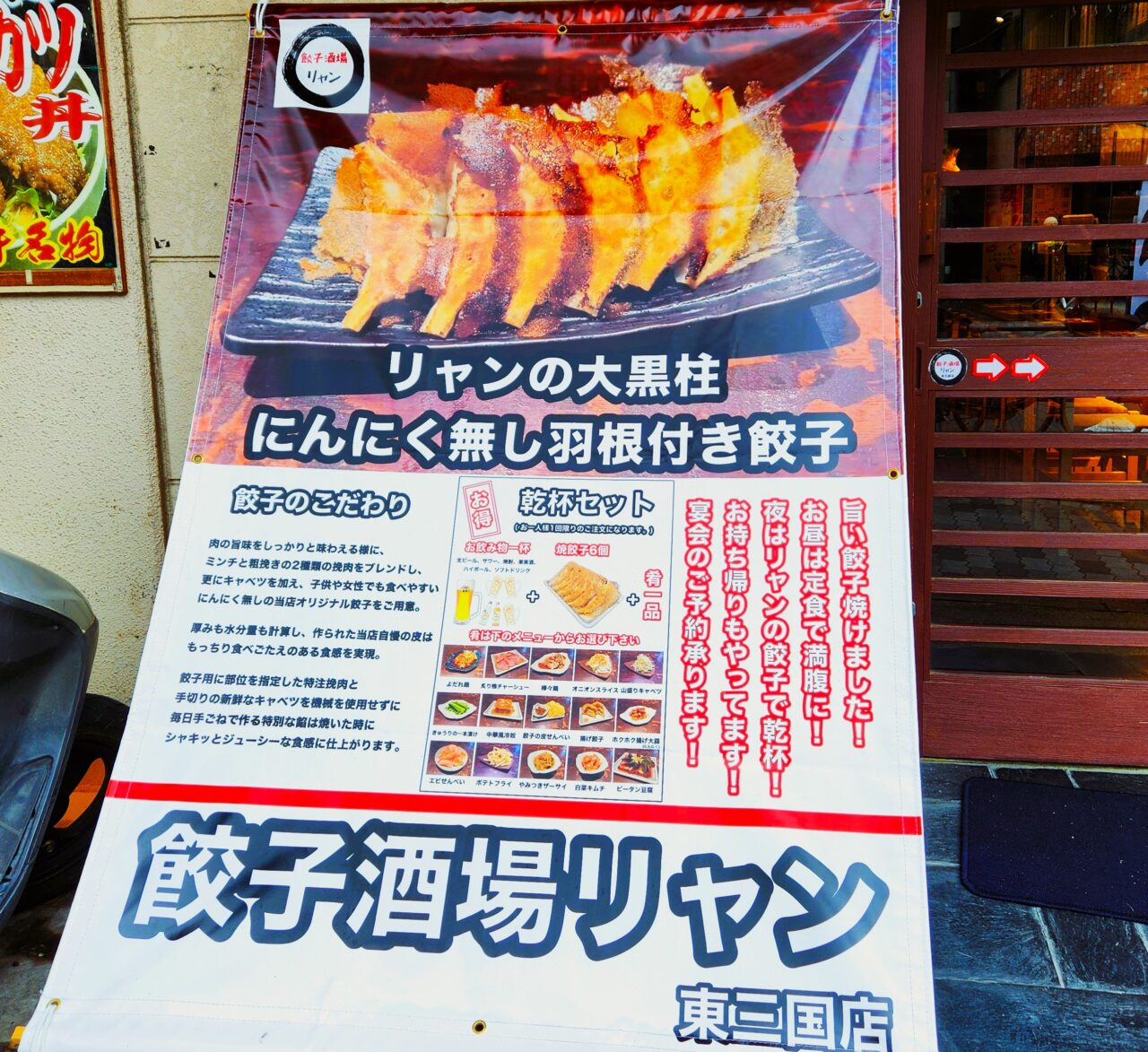 入り口に掛かった大きな餃子のタペストリーが『餃子酒場リャン東三国店』の看板商品「ニンニク無し羽根つき餃子」をアピールしています。