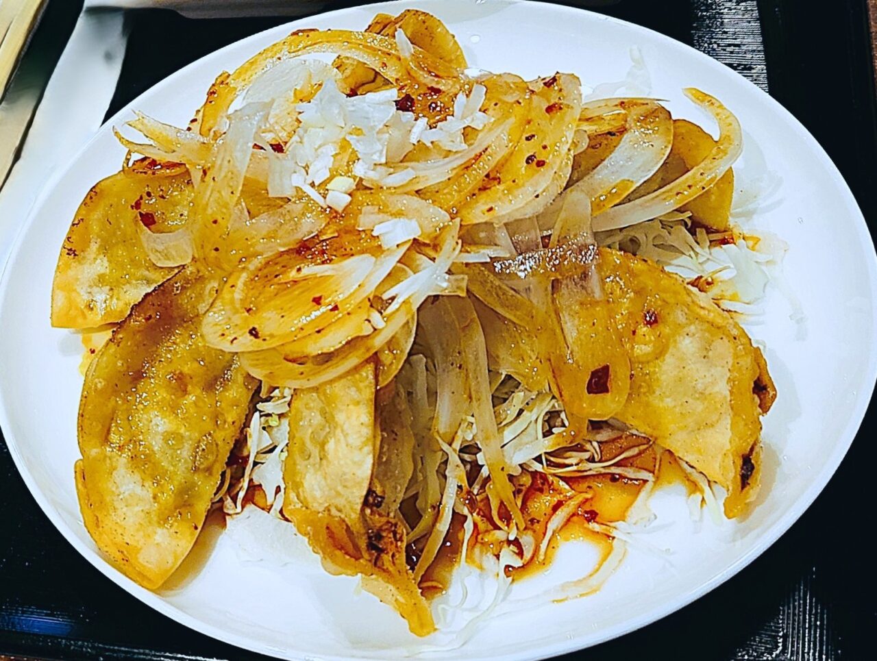 「油琳餃子」は「ニンニク無し羽根つき餃子」の上にスライス玉ねぎと白髪ねぎをトッピングし油琳鶏のたれが掛かったもの。料理人さんの腕前がかなりのものだとわかる綺麗な盛り付け。