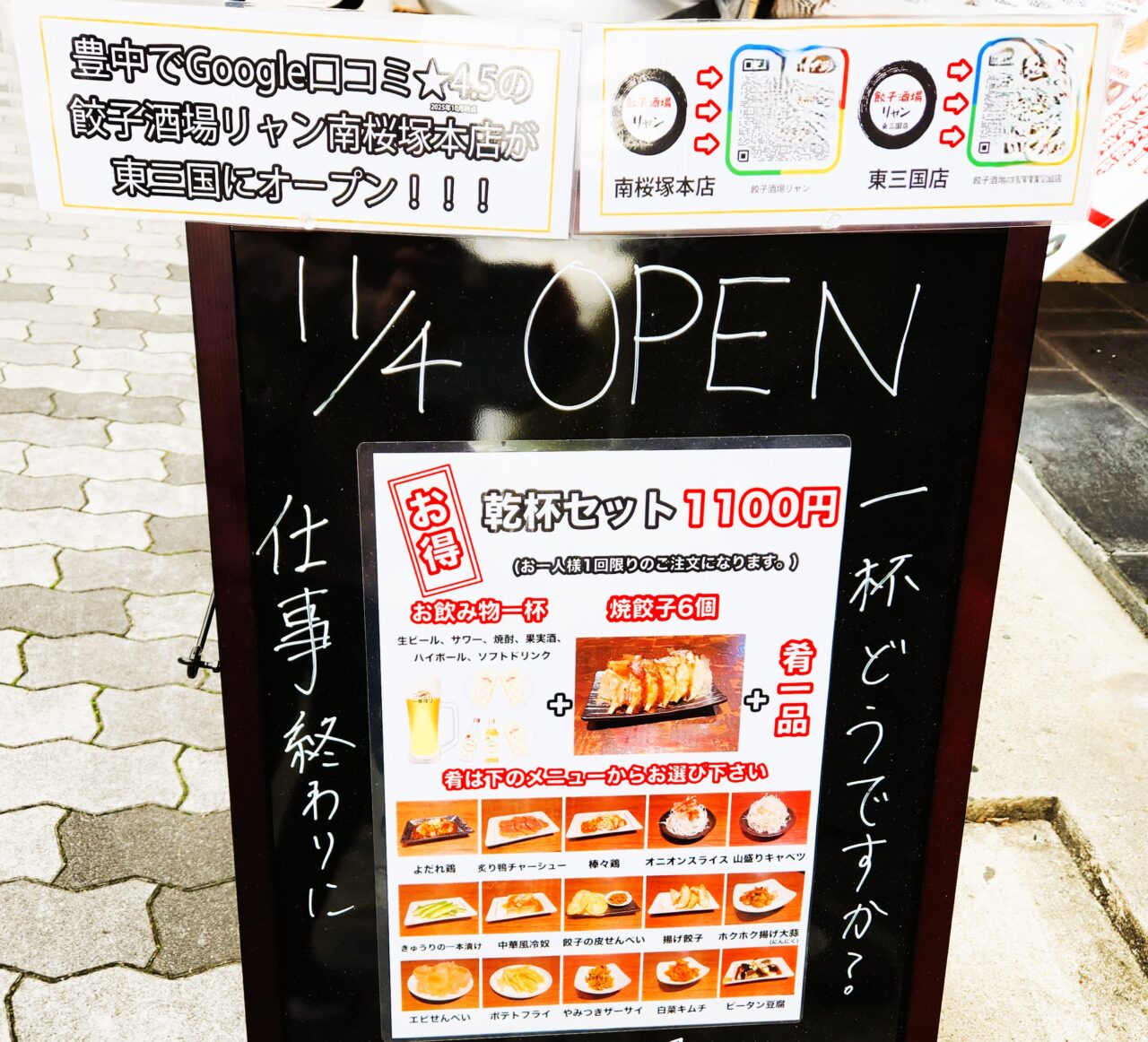 大阪メトロ御堂筋線東三国駅から西へ徒歩約10分の東三国5丁目に新店『餃子酒場リャン東三国店』がオープンしています。オープン日は2025年11月4日(火)。こちらはオープンの時の写真です。実際に訪れてランチを食べてみました。