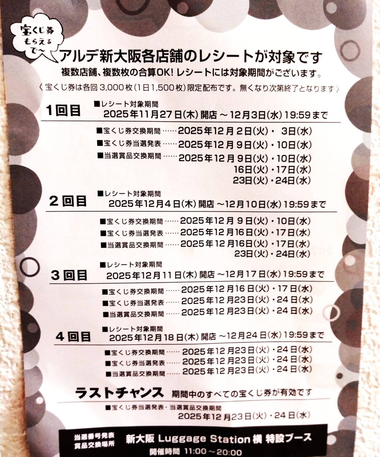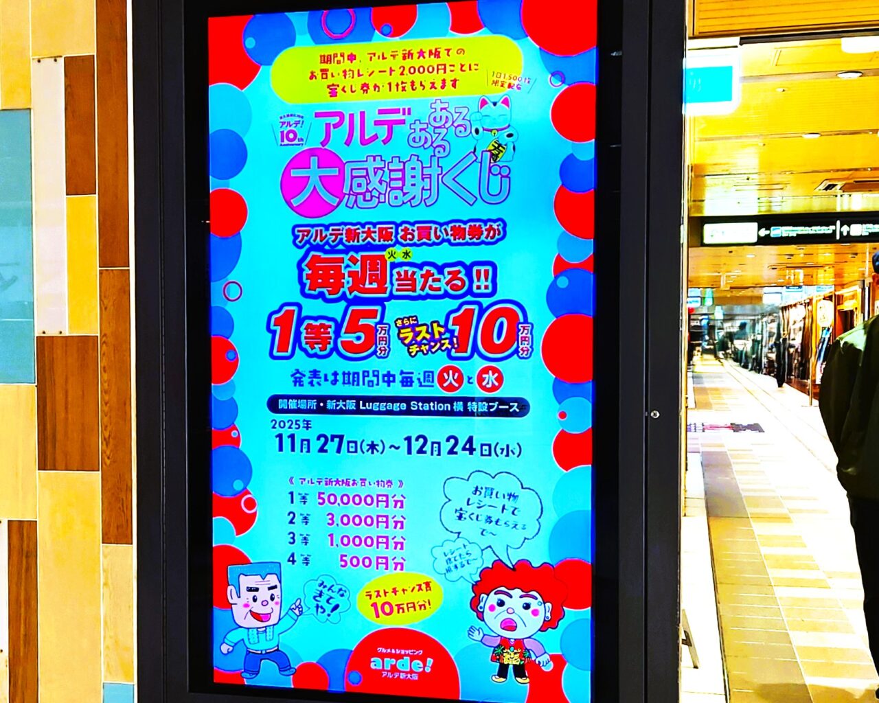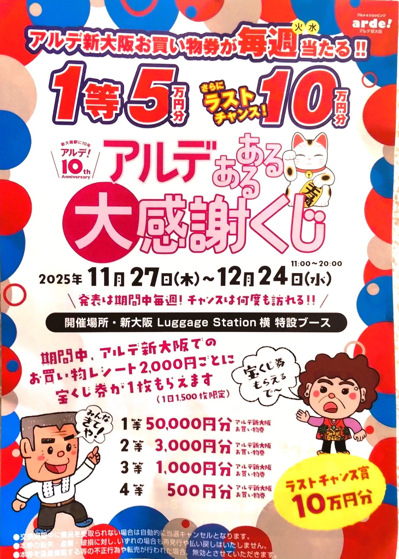 【大阪市淀川区】2週間ごとに抽選♪アルデ新大阪10周年記念企画『毎週火・水当たる!!アルデあるある大感謝くじ』開催中。1等は5万円お買物券。12月24日(水)まで。
