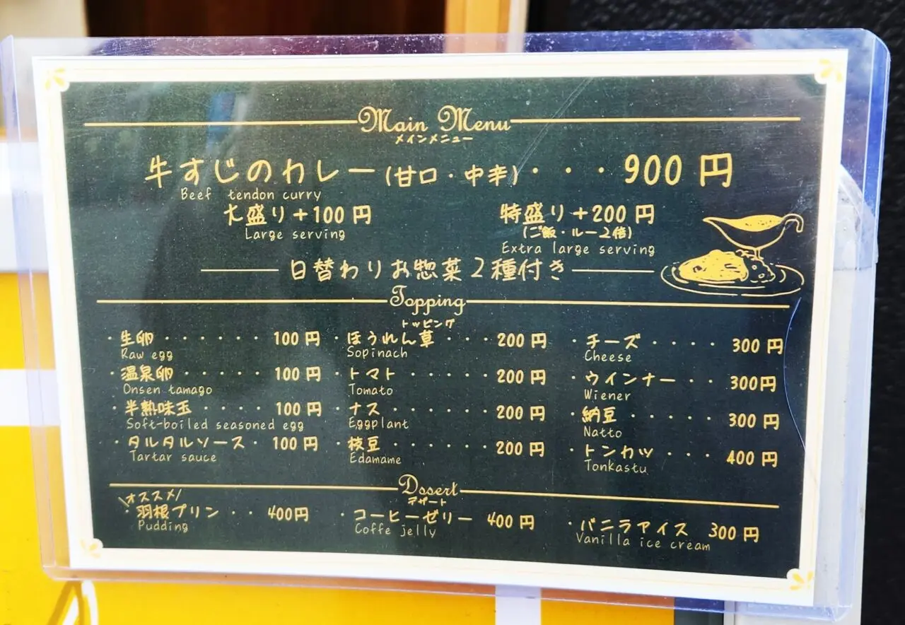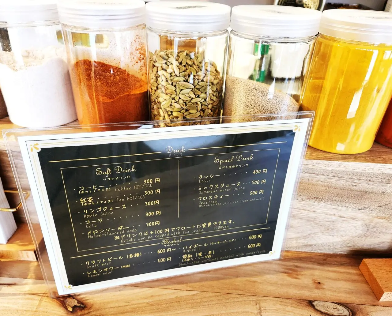 こちらがお料理のメニューです。店長さんのお話では、カレーはルーから手作りのグルテンフリー。お好みに応じて色んなトッピングもプラスできます。(価格は税込)