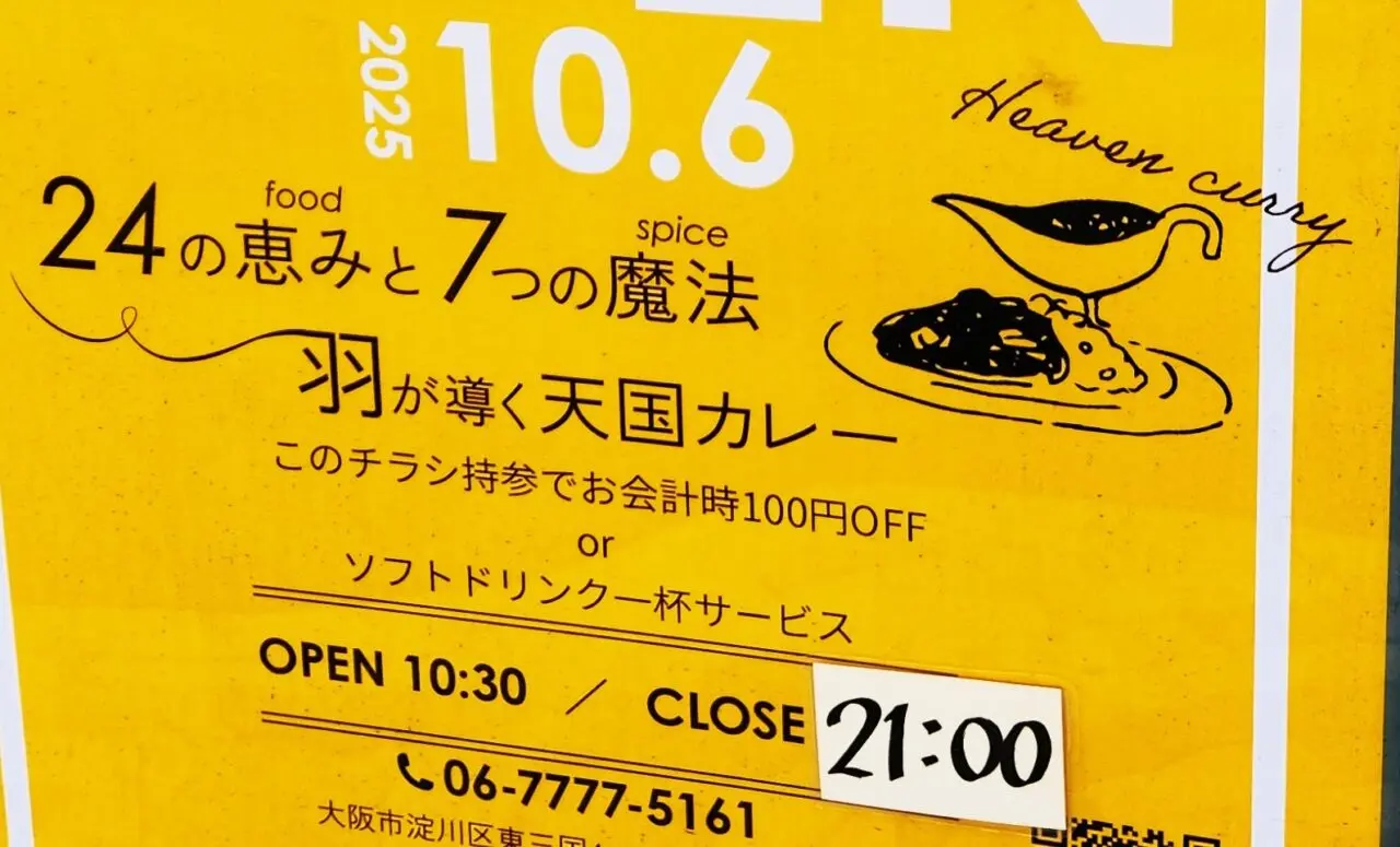 大阪メトロ御堂筋線東三国駅から徒歩約7~8分の東三国4丁目に新しいカレー専門店『HeavEN 東三国店』がオープンしています。オープン日は2025年10月6日(月)。地元の友人によると、個性的で美味しいグルテンフリーのカレーが人気とか。実際に訪れてみました。こちらは『HeavEN 東三国店』の店頭の看板です。