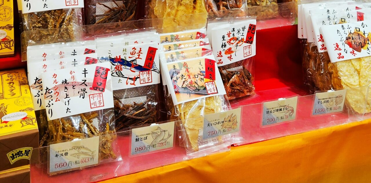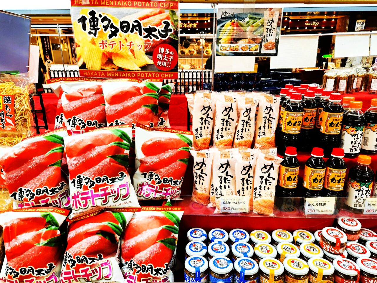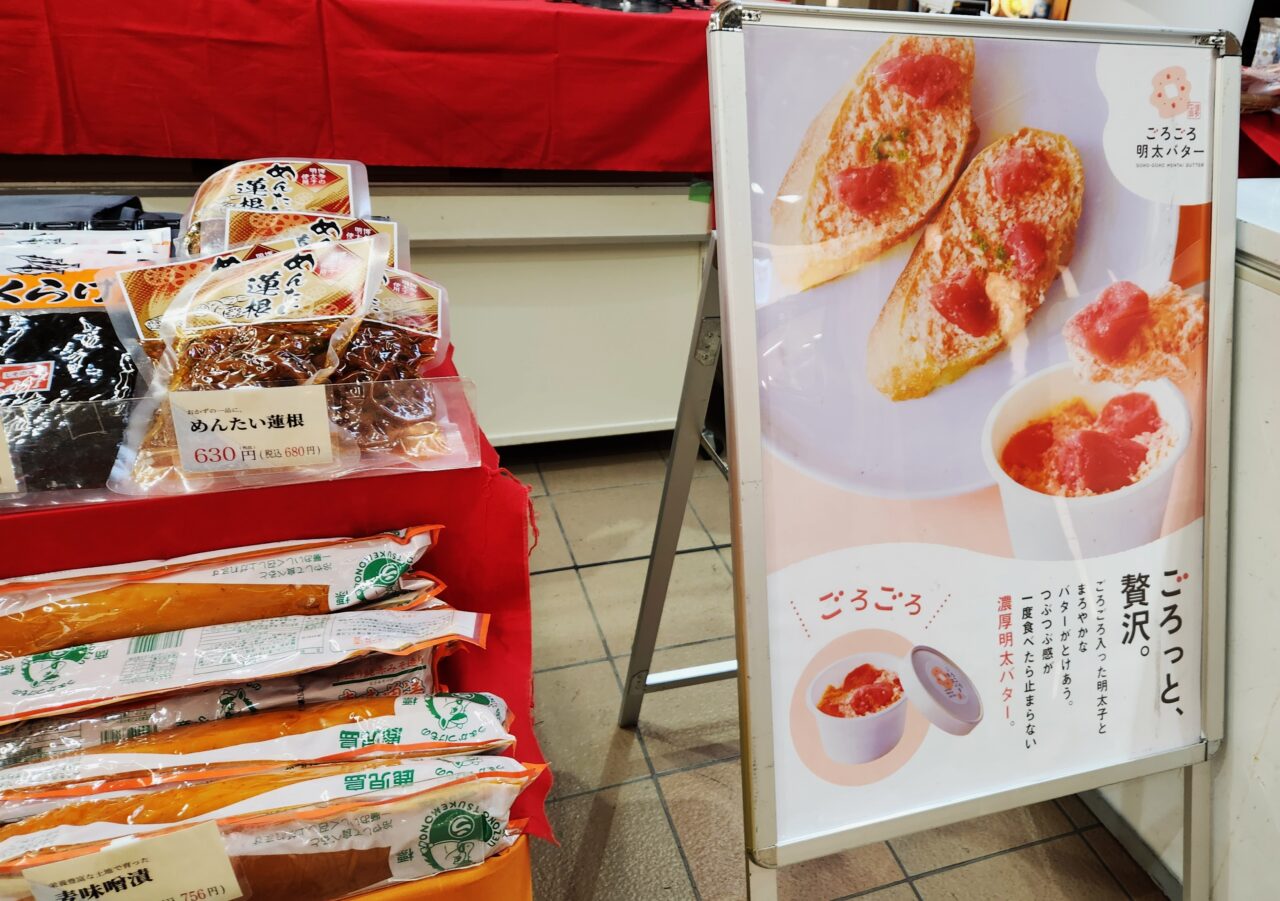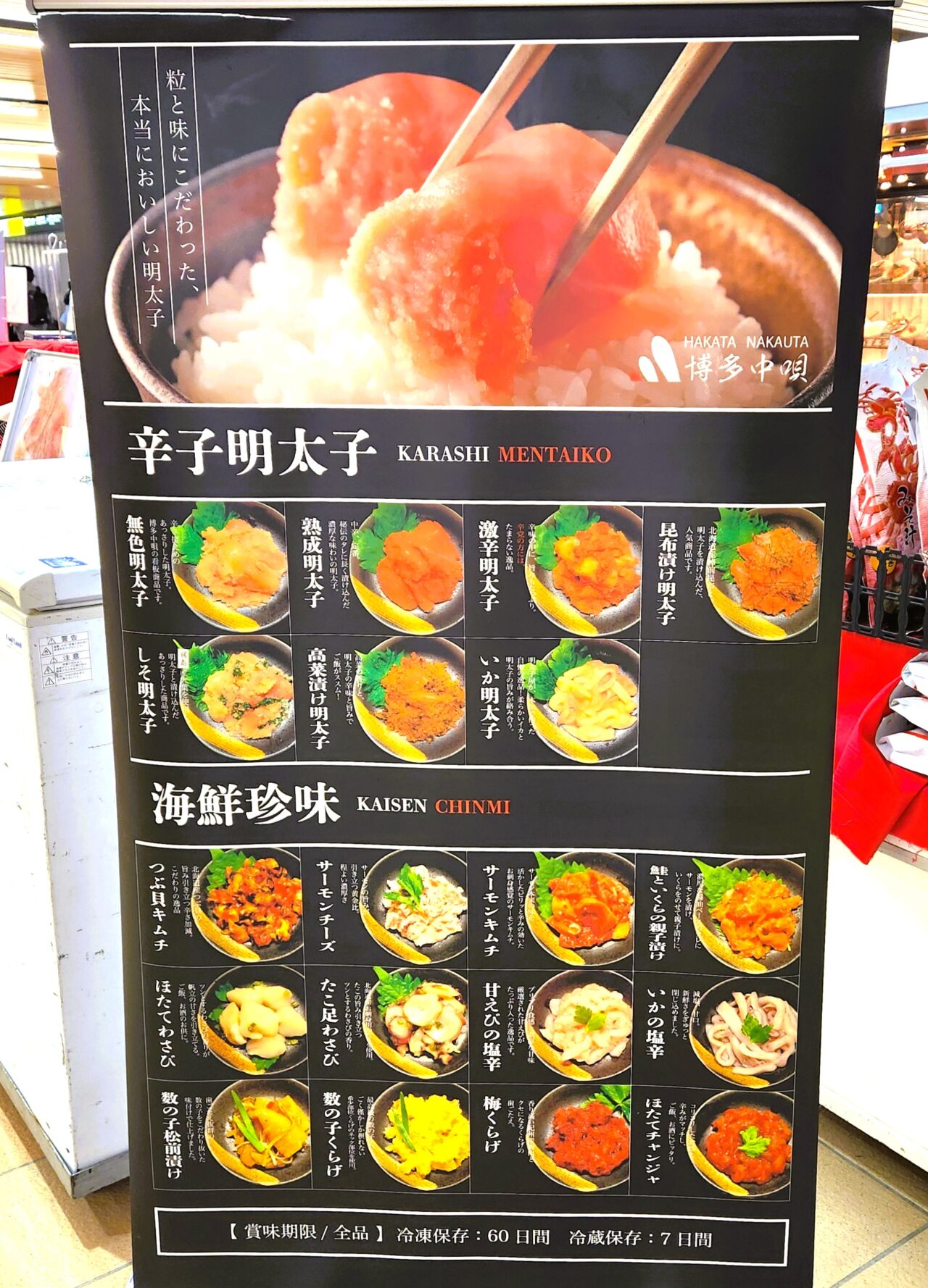 明太子の直売で知られた「博多中唄」が運営元の期間限定ショップ『博多中唄(明太子直売)』のコーナーには、明太子や明太子を使用したユニークな商品が販売されています。こちらは販売されている明太子や珍味が一目でわかるジャンボpop。