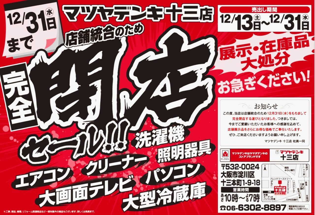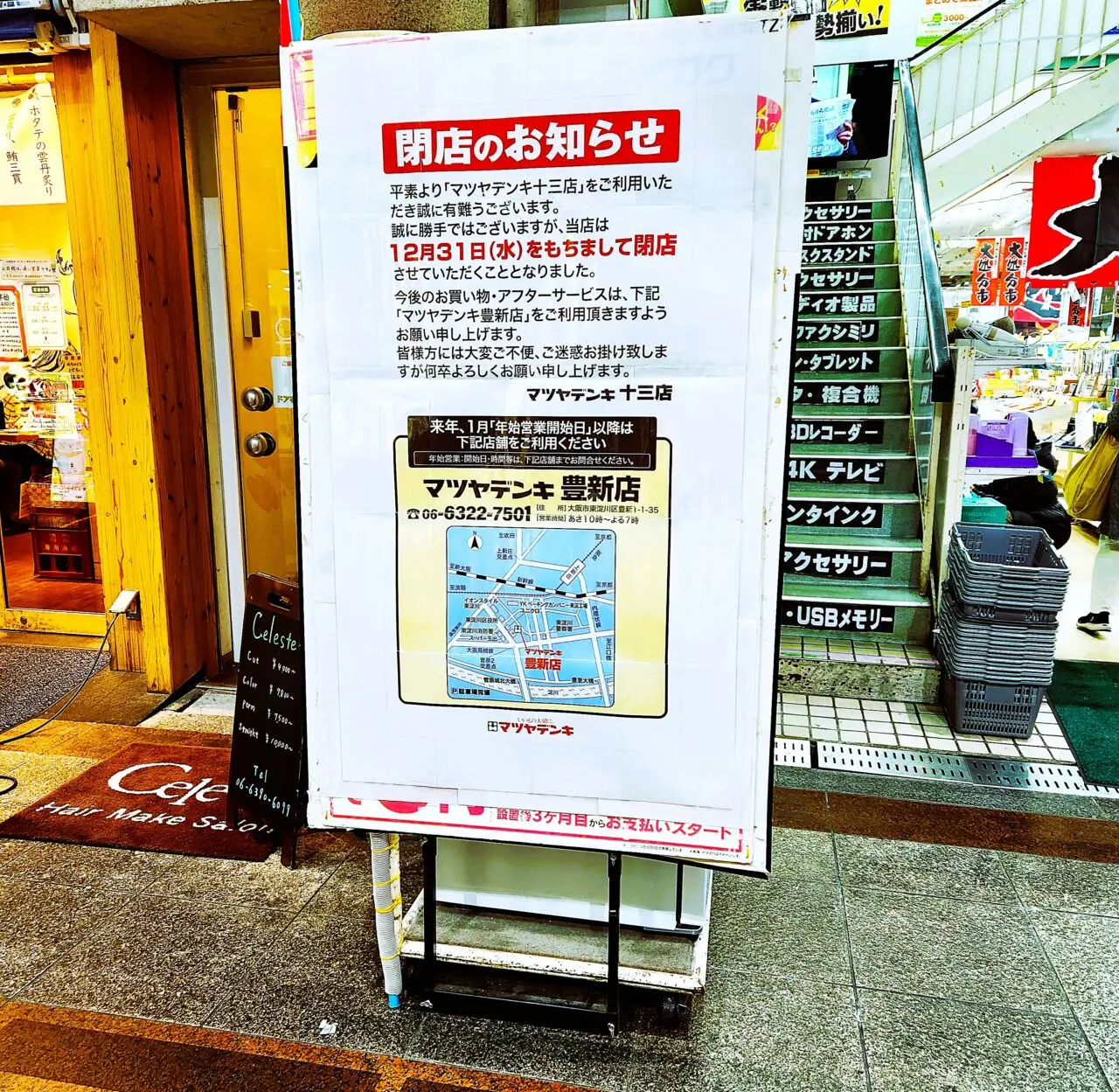 【大阪市淀川区】悲報。「十三フレンドリー商店街」の家電専門店『マツヤデンキ 十三店』12月31日(水)閉店。「完全閉店セール」実施中。