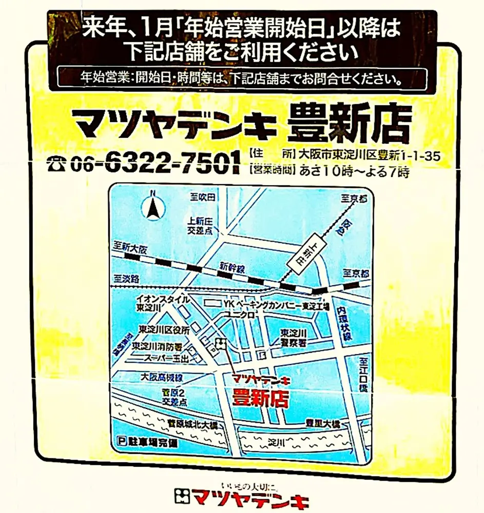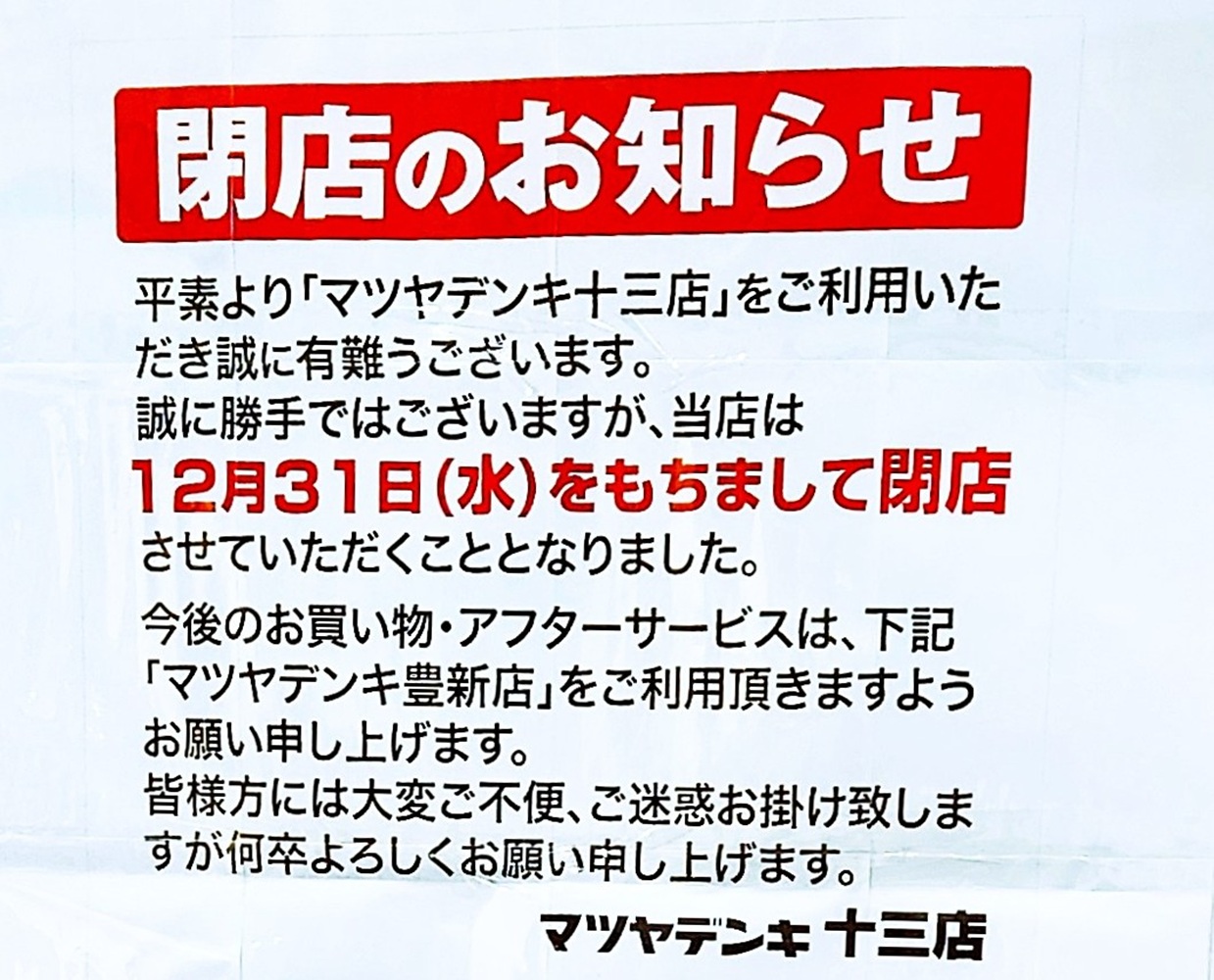 近寄ってみましょう。閉店後のお買物やアフターサービスは、最寄り店の「マツヤデンキ豊新店」が引き継ぐようです。