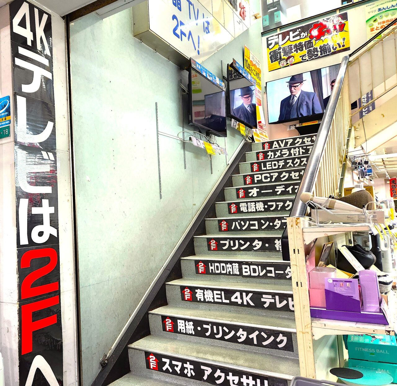 パソコンやテレビ、オーディオ等の売り場は2階になっており「テレビが安い、衝撃特価」等のpopが見えます。