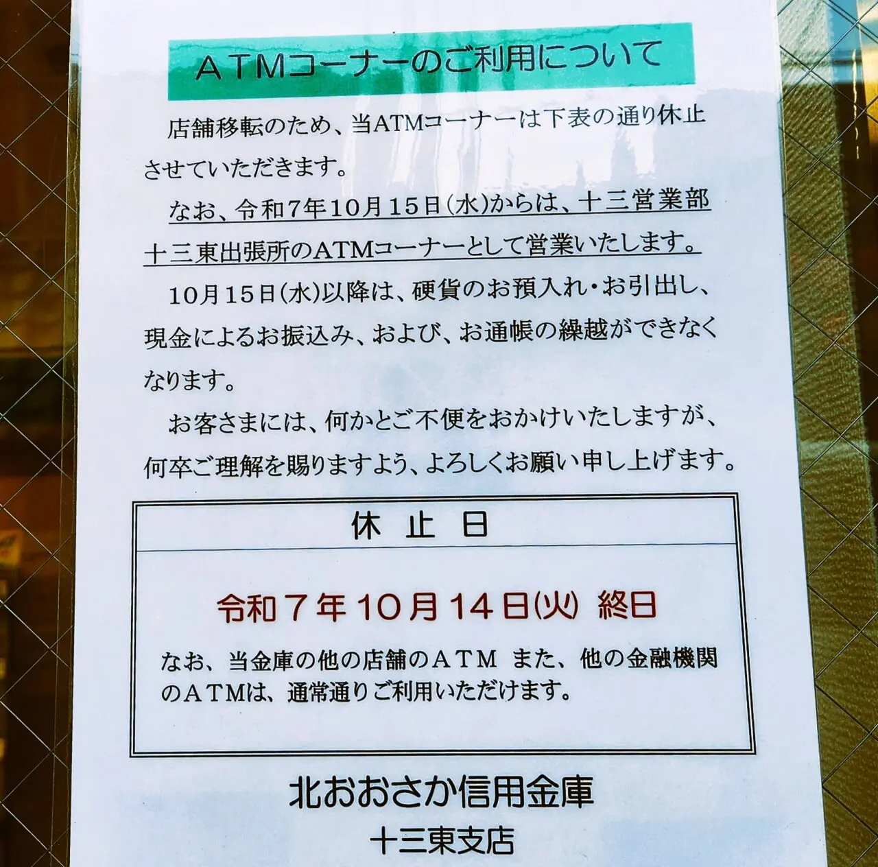 【大阪市淀川区】十三東三仲町通『北おおさか信用金庫十三東支店』はATMのみが稼働する『北おおさか信用金庫十三営業部十三東出張所』に。2026年の全店営業休止日も発表されています。