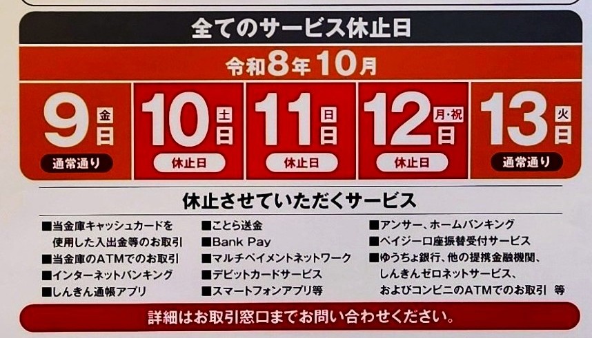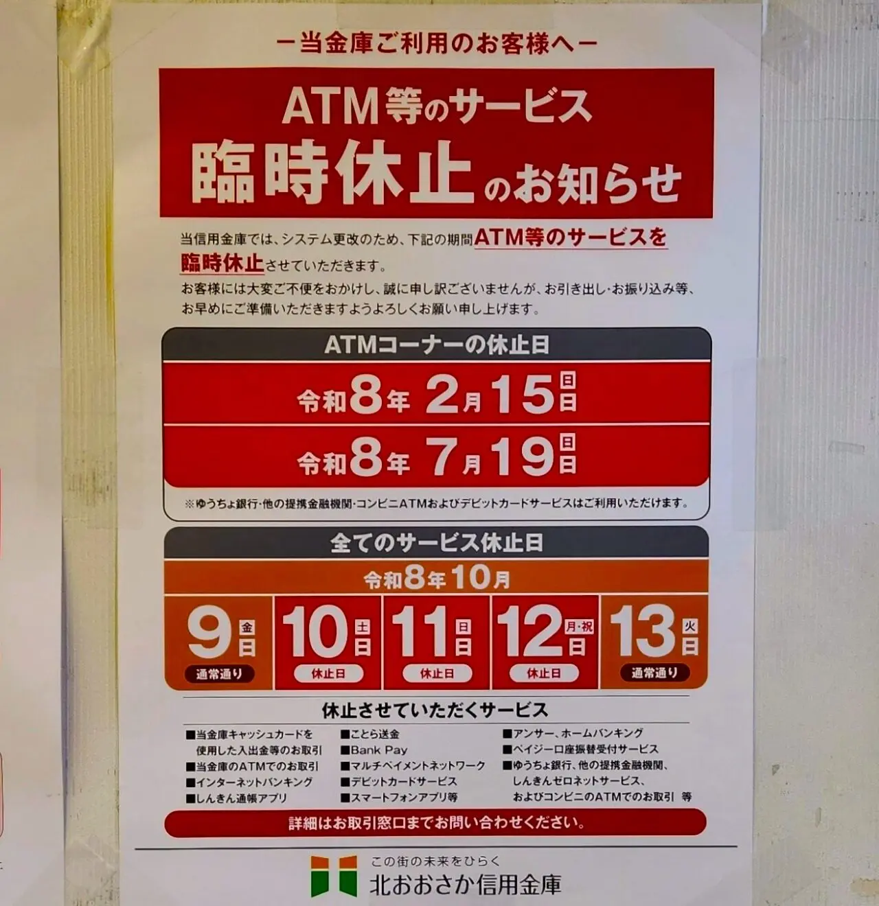 また『北おおさか信用金庫』では、システムの更改も予定されており「ATM等のサービス 」が臨時休止する日程が発表されています。こちらは、その貼り紙です。