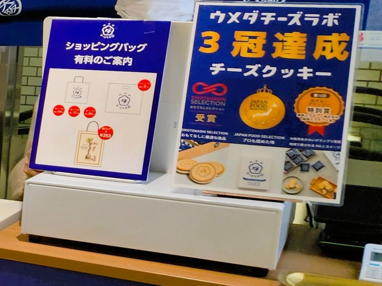 売り場に『ウメダチーズラボ』が「3冠達成」というpopがありました。