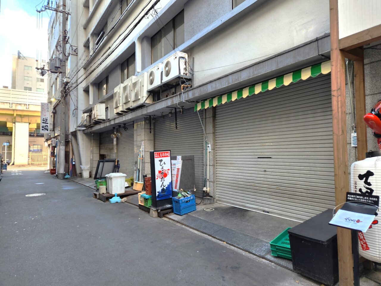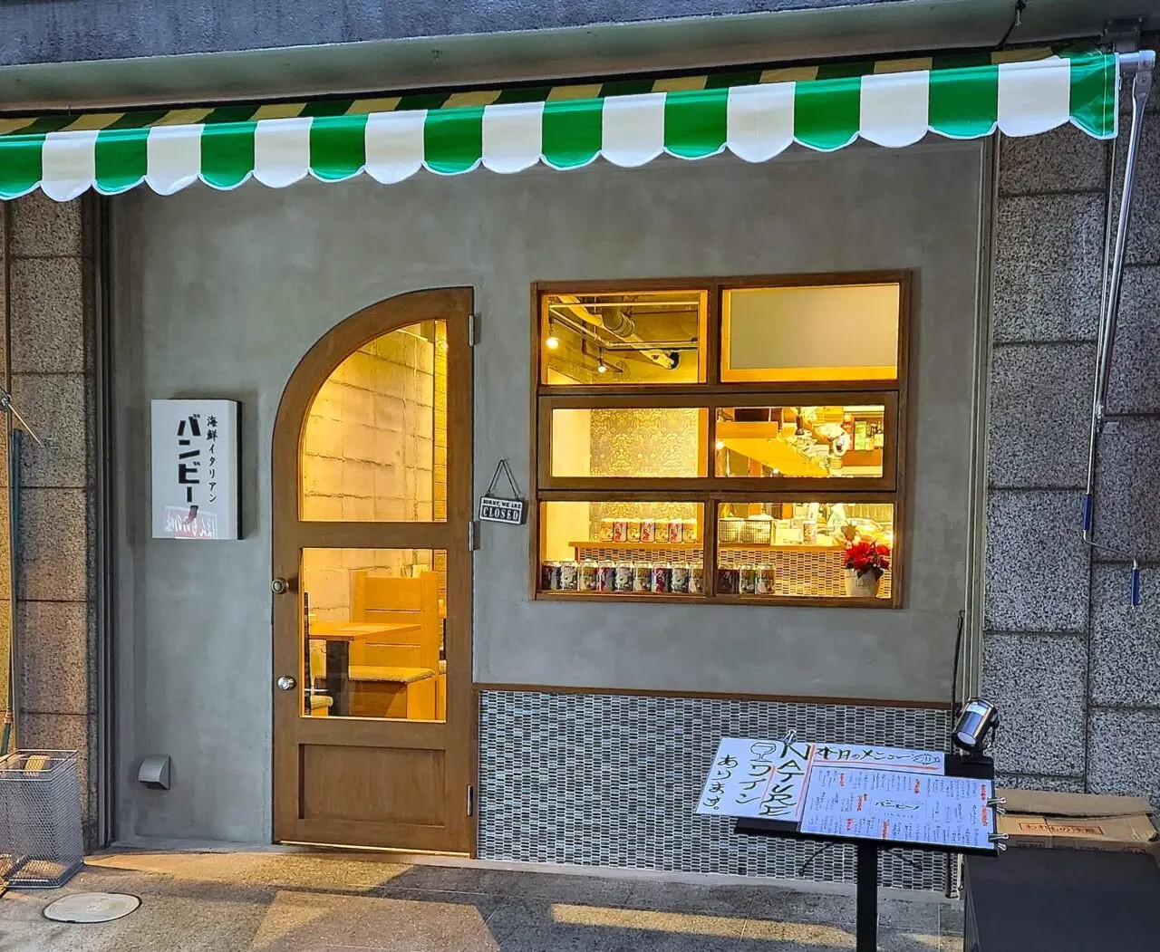 『海鮮イタリアン バンビーノ』の場所は既にシャッターが閉められ、お洒落な緑と白のツートーンのファサードのみが残っています。特に「閉店のご案内」的な貼り紙もありませんでした。
