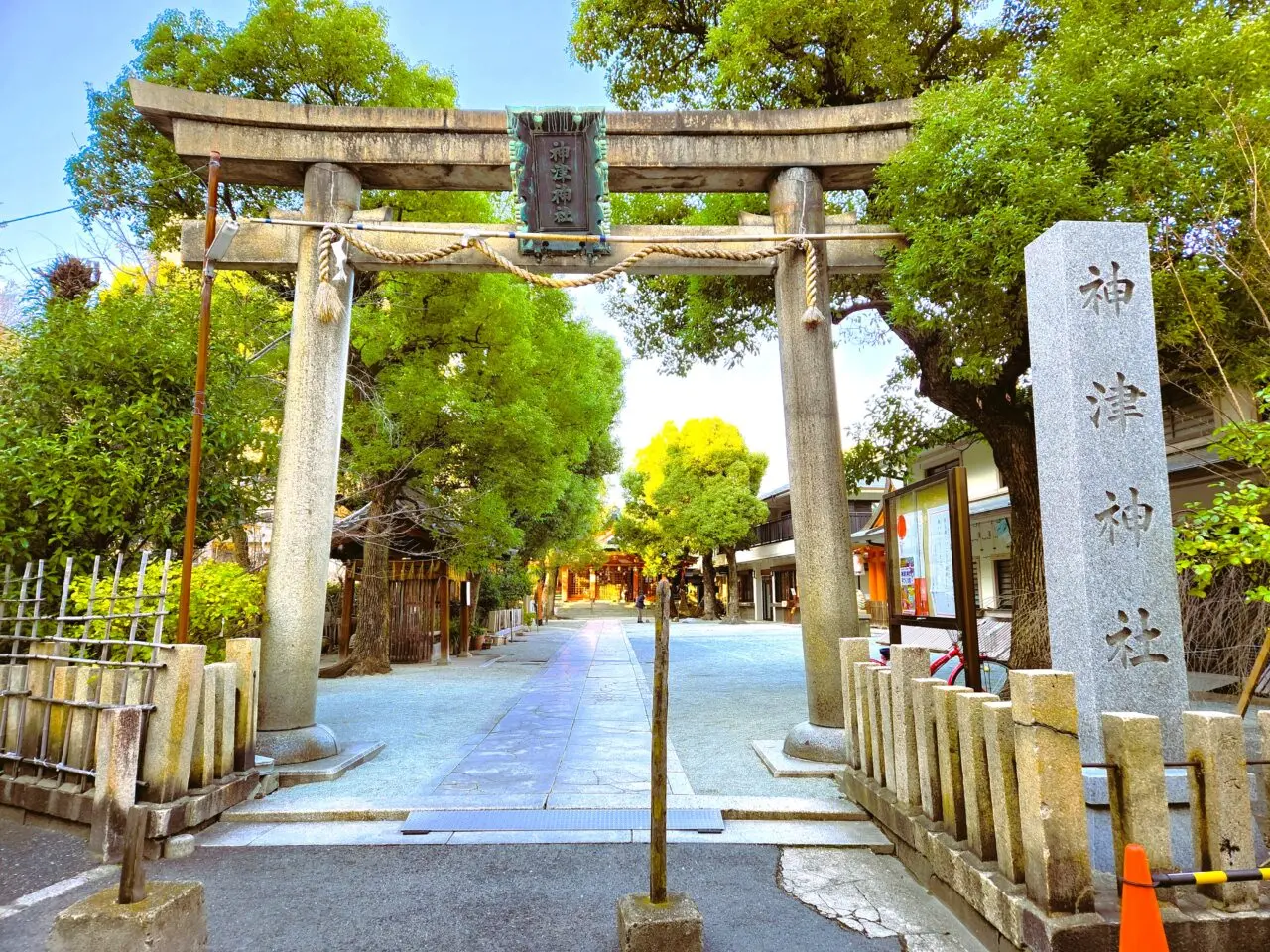 屋根が途切れたところを左へ曲がると、参道の向こうに「神津神社」の立派な鳥居が見えます。
