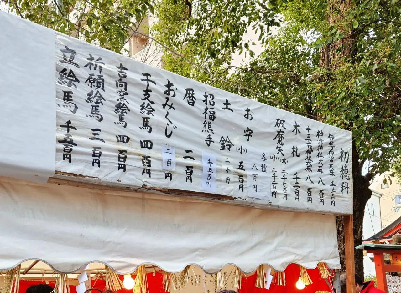 お守り、おみくじ、絵馬等のコーナーには、事前に支払いを準備できるよう大きな文字でわかりやすく価格が掲示されていました。
