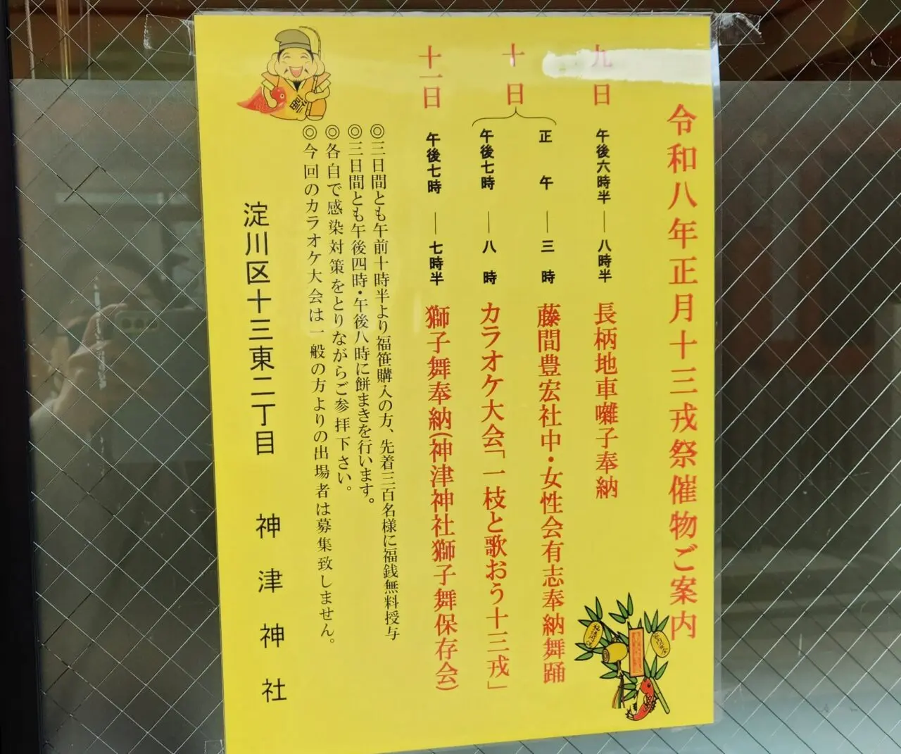 境内にある社務所には1月9日からの「十三戎(とみえびす)祭」の予定表が貼ってありました。