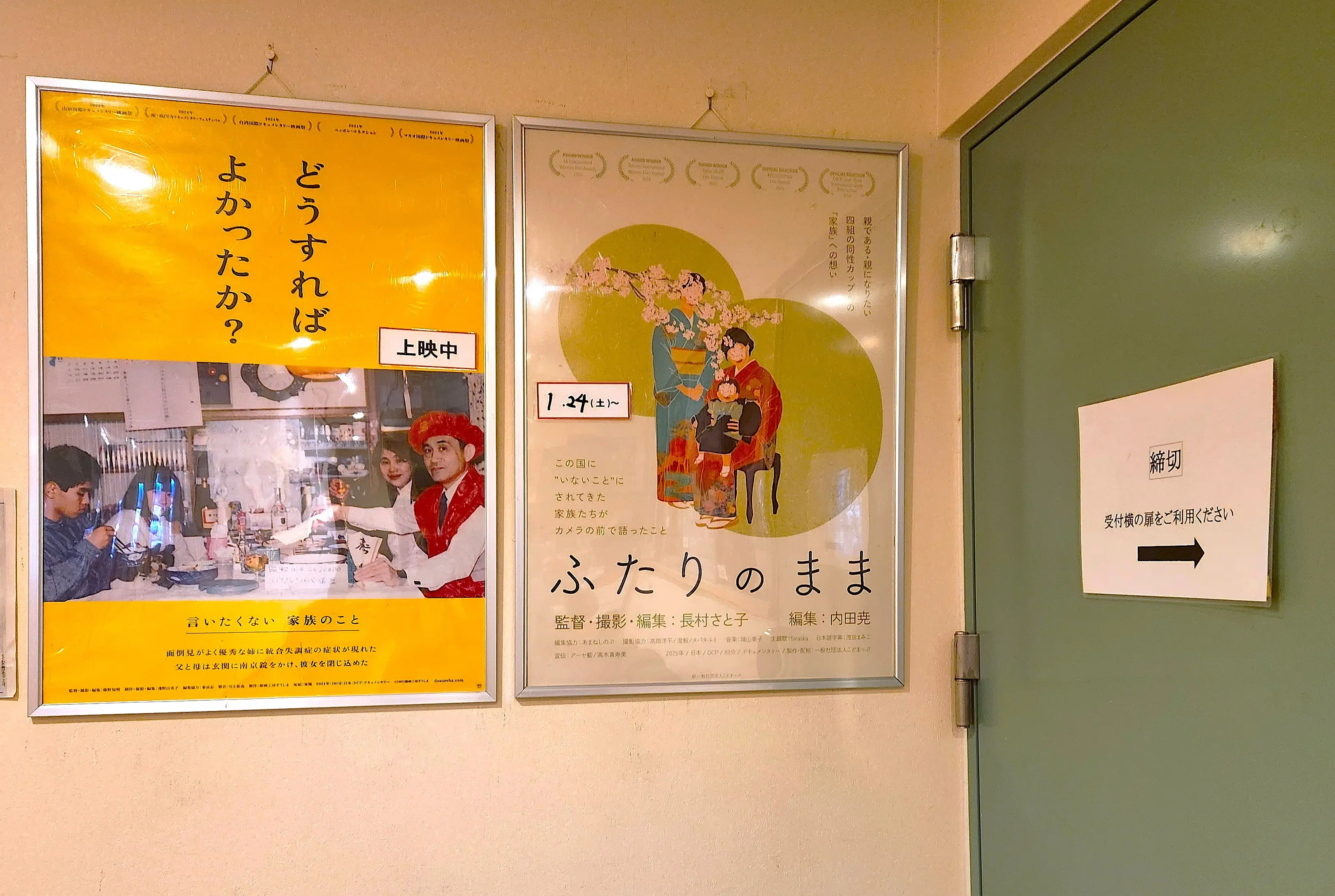上映間近の「シアターセブン」を訪れてみました。壁面のパンフレットラックには、上映中や上映予定等の色んなパンフレットが並んでいます。ドキュメンタリー映画『ふたりのまま』のものもありますね。(※真ん中あたりの上から3段目)