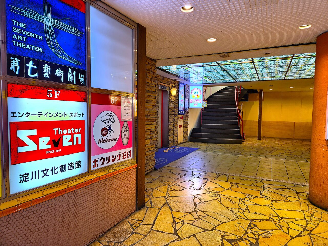 上映劇場のシアターセブンは、阪急電車十三駅西口から徒歩3~4分の十三サカエマチ商店街にある映画館。ボウリング場もあるサンポードシティビルの5階です。