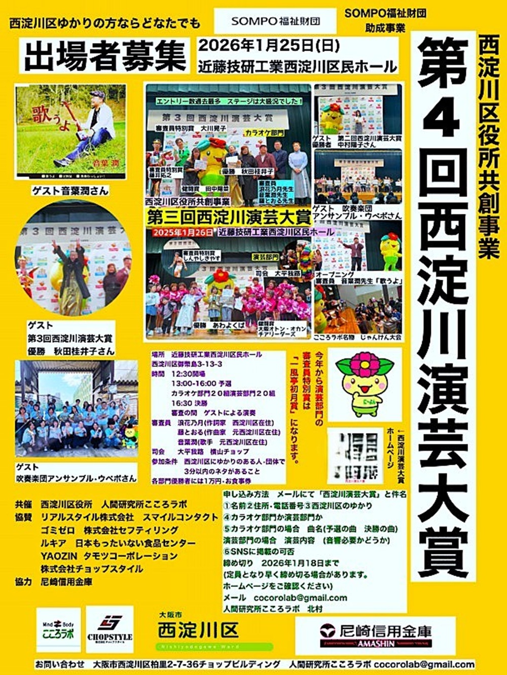 2026年1月25日(日)に、近畿技研工業西淀川区民ホールで『第4回西淀川演芸大賞』が開催されます。大阪市役所のホームページによれば、今回のイベント「人間研究所こころラボと西淀川区役所との共創事業」として実施されるものです。(下記のような概要も載っています。)