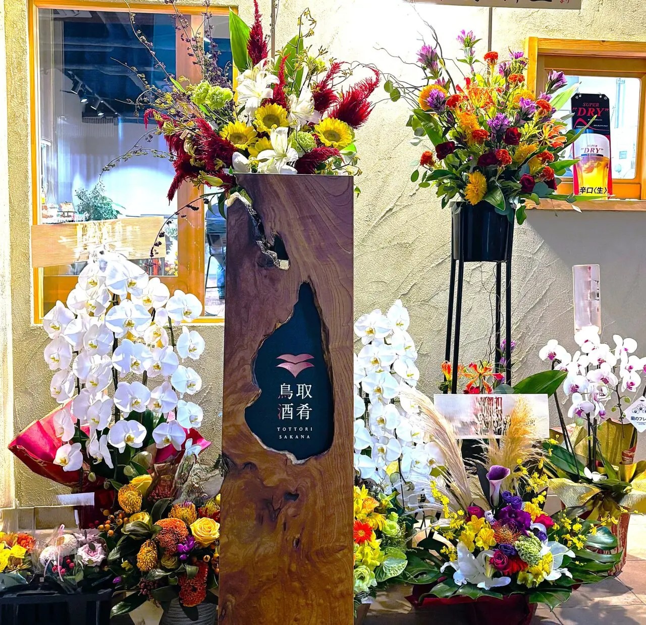こちらはオープン時の祝花に飾られた『鳥取酒肴(とっとりさかな)』の看板です。