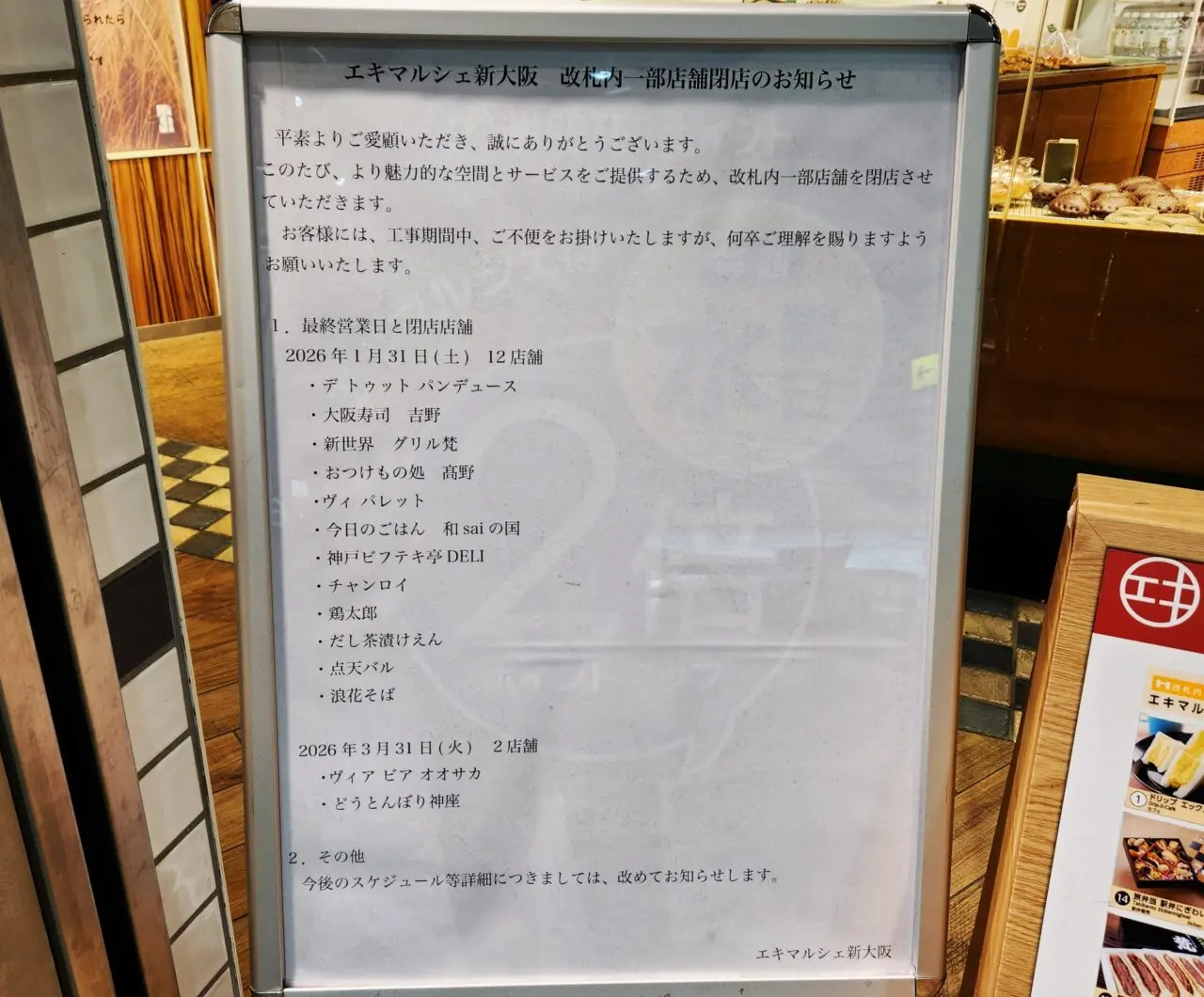 【大阪市淀川区】速報。人気店「どうとんぼり神座エキマルシェ新大阪店」も閉店。大規模改装の為『エキマルシェ新大阪』の約三分の一のお店が閉店に。