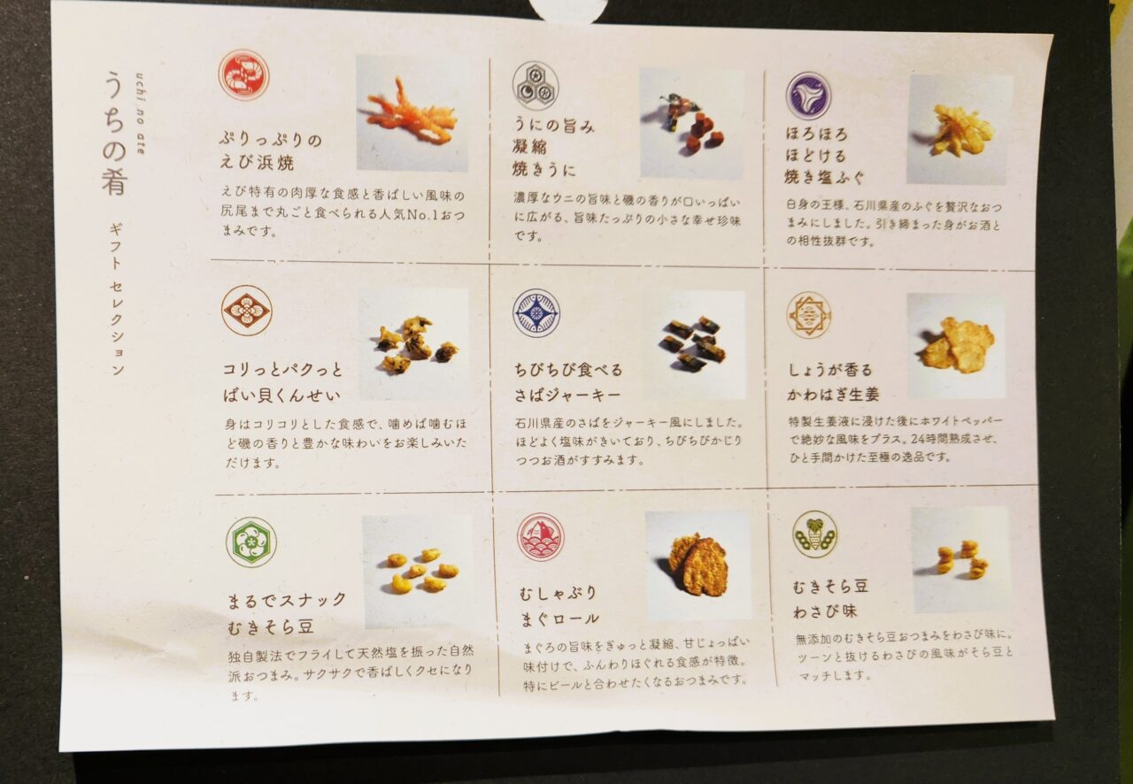 「ギフトセレクション」に入ってる「おつまみ」の説明popです。素材は魚介の他、野菜、ナッツ等。