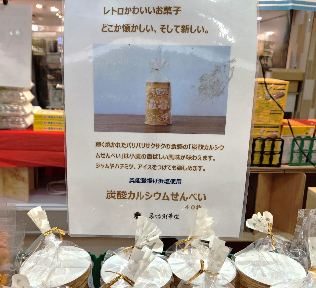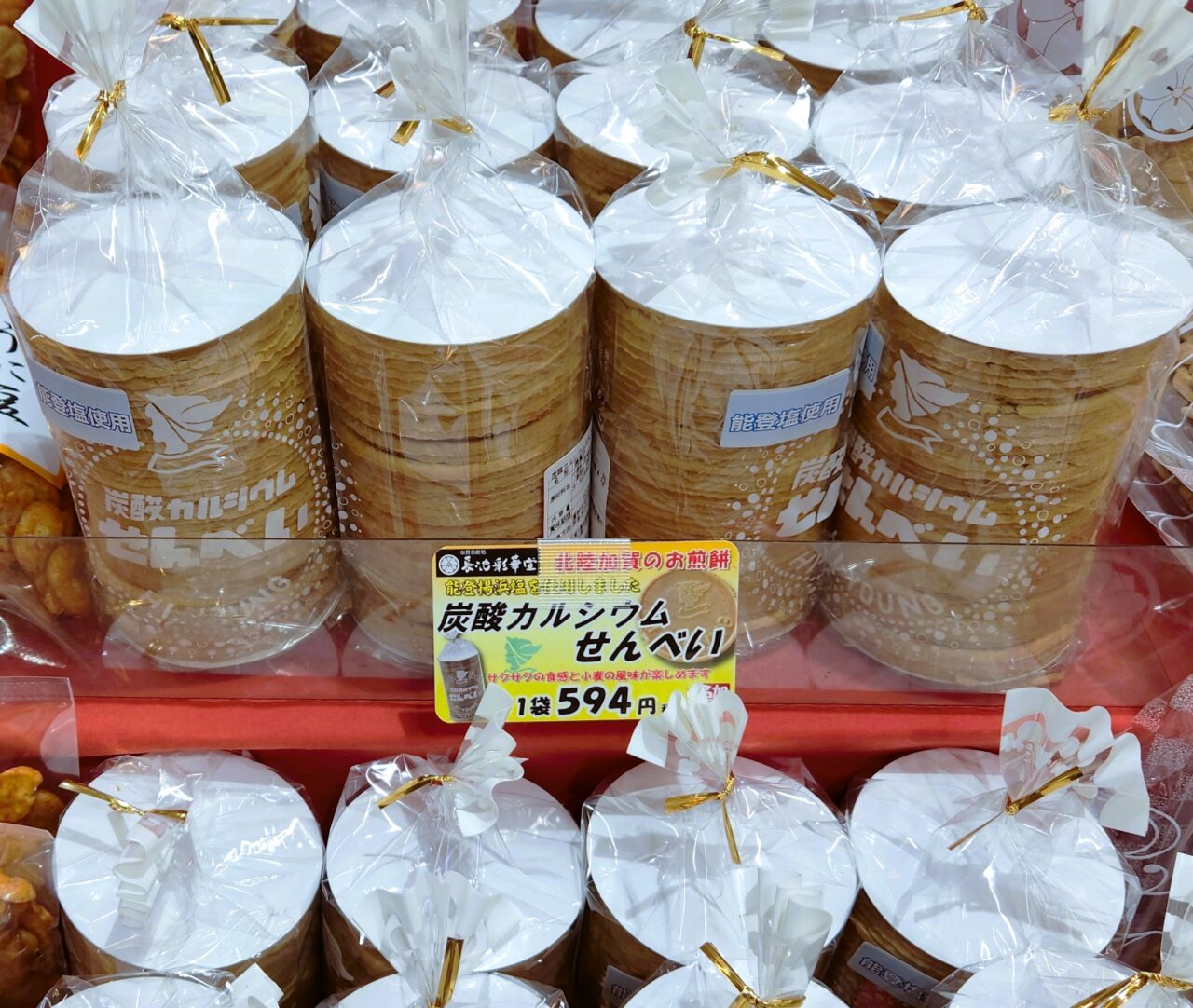 美味しくてコスパなお菓子から贈答品としても喜ばれそうなお菓子まで、スイーツも色々揃っています。こちらの「炭酸カルシウムせんべい」もポピュラーなお菓子ですが、奥能登の揚げ浜塩を使用したというところが北陸ならでは。