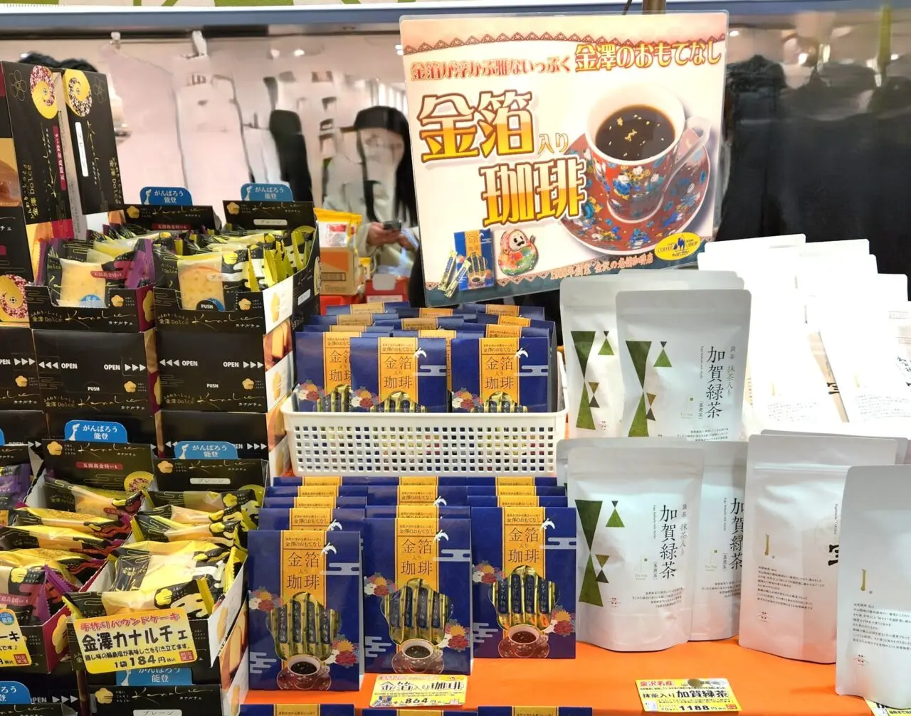 「加賀棒茶」等の飲み物のコーナー。