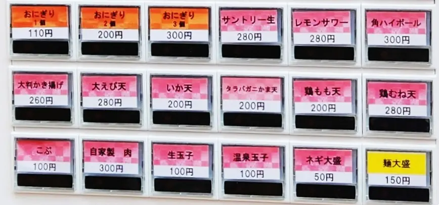 下の3段はトッピングやドリンクのボタン。麺大盛のボタンもありますよ。『天ぷらうどんそば 味満』では各種おにぎりといなりずしも食べられますが「おにぎり」の食券を買って店内で種類を指定するようになっています。1個110円(税込)ですが、2個以上だと1個あたり100円(税込)になって割安に。
